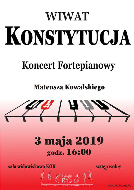 Na piątek zaplanowano uroczystości z okazji Święta Konstytucji 3 Maja. O godz. 10.30 w farze odprawiona zostanie msza w intencji Ojczyzny. Na godz. 11.30 zaplanowano złożenie kwiatów przy pamiątkowych tablicach na kościańskim Rynku. Patriotyczne melodie zagra Orkiestra Dęta OSP Kościan. O godz. 16 w sali widowiskowej Kościańskiego Ośrodka Kultury odbędzie się koncert fortepianowy. Zagra Mateusz Kowalski.
