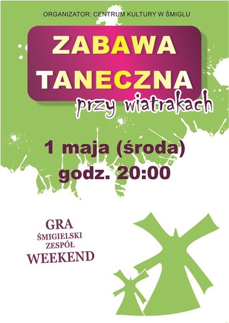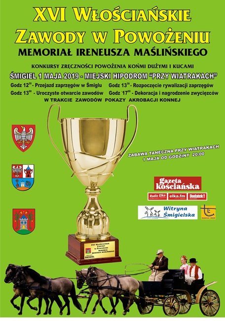 Tradycyjnie 1 maja w Śmiglu odbędą się Włościańskie Zawody w Powożeniu Zaprzęgami. Konna majówka rozpocznie się o godz. 12.20. Wówczas uczestnicy zawodów ruszą na paradę ulicami Śmigla. Na godz. 13 zaplanowano oficjalne otwarcie imprezy i prezentację zawodników. Rywalizacja rozpocznie się o godz. 13.30. Wręczenie nagród dla zwycięzców i zakończenie zawodów nastąpi około godz. 17. W trakcie zawodów zaplanowano pokazy akrobacji konnej. Na godz. 20 przy śmigielskich wiatrakach rozpocznie się pierwsza w tym roku zabawa taneczna. Zagra śmigielski zespół Weekend.