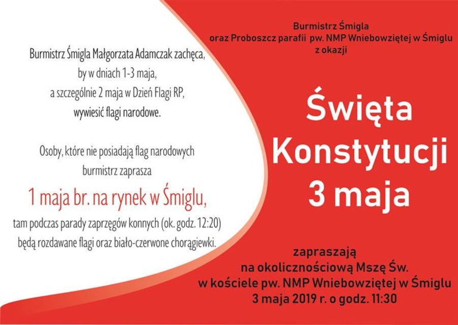 W Święto Konstytucji 3 Maja o godz. 11.30 w śmigielskiej farze odprawiona zostanie uroczysta msza w intencji Ojczyzny.