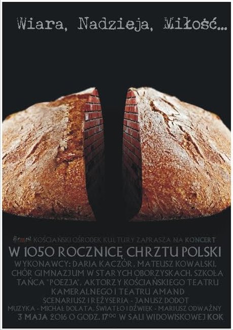 O godzinie 17. w Kościańskim Ośrodku Kultury odbędzie się koncert „Wiara, Nadzieja, Miłość - w 1050. rocznicę Chrztu Polski” w reżyserii Janusza Dodota. Wystąpią: Mateusz Kowalski, Daria Kaczór, Chór Gimnazjum w Starych Oborzyskach, aktorzy KTK i grupa teatralna „Amand”, Szkoła Tańca „Poezja”, opr. muz. Michał Dolata, światła i dźwięk Mariusz Odważny. Wstęp wolny,