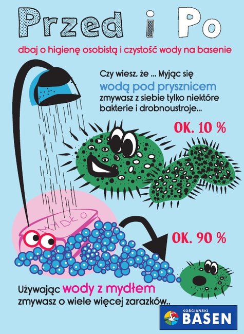 Z plakatów, które już pojawiły się w kościańskiej pływalni można wyczytać, że używając wody pod prysznicem zmywa się około 10% bakterii i drobnoustrojów. Mydło pozwala na usunięcie ze skóry około 90%. Plakaty przypominają także o konieczności umyciu ciała po wyjściu z toalety, używaniu czystych klapek, stosowaniu czepków i okularów. Warto także pamiętać o tym, żeby nie pożyczać ręcznika drugiej osobie.