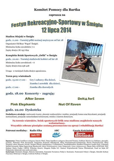 Na najbliższą sobotę, 12 lipca przyjaciele Bartka przygotowali akcję charytatywną. Jej rozpoczęcie zaplanowano na godz. 11. Na stadionie miejskim w Śmiglu rozegrany zostanie turniej piłkarski. Organizatorzy przewidzieli udział szesnastu drużyn. Przy wejściach na obiekt sportowy prowadzona będzie zbiórka pieniędzy. Zakończenie rozgrywek planowane jest na godz. 17. O godz. 11 rozpocznie się także turniej piłki siatkowej dla kobiet w wieku od 18 lat. Natomiast popołudniu, w godz. 15 - 17 przy śmigielskich wiatrakach odbędzie się festyn. Na dzieci czekać będą gry i zabawy z nagrodami oraz zumba. Taneczne zajęcia przygotowano również dla pań. Uczestnicy festynu będą mogli skorzystać z przejażdżek samochodami terenowymi, bryczkami i konno. Harcerze ze śmigielskiego ZHP wszystkim chętnym zaplotą warkoczyki. Maluchy będą mogły korzystać z malowania twarzy. I podczas sportowych rozgrywek, i podczas festynu sprzedawane będą domowe ciasta. Na godz. 18 zaplanowano koncerty. Na scenie przy wiatrakach zagrają: After Seven, Deltafors, Ping Elephants i Nut od Raven.