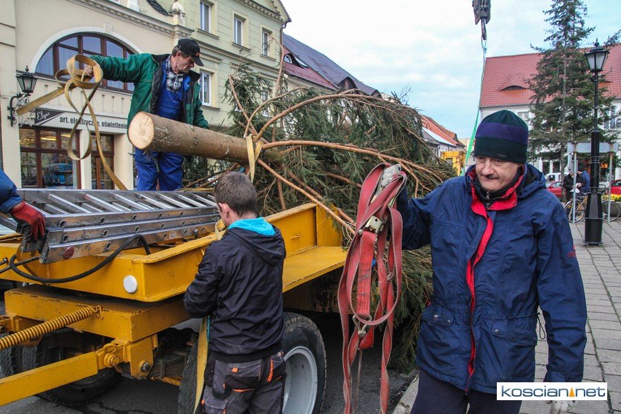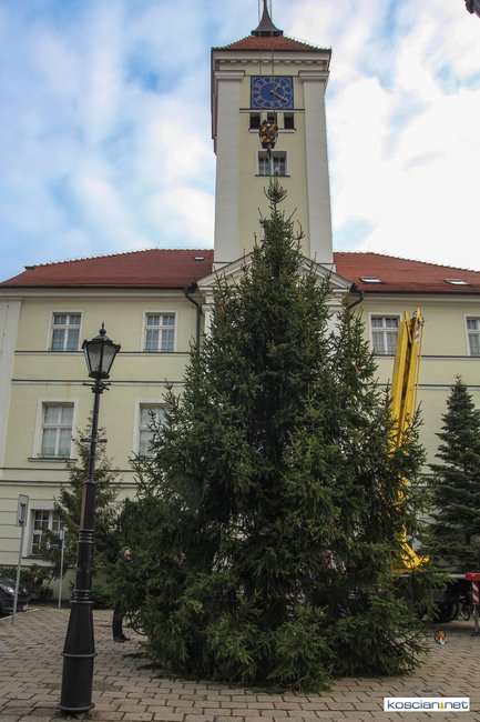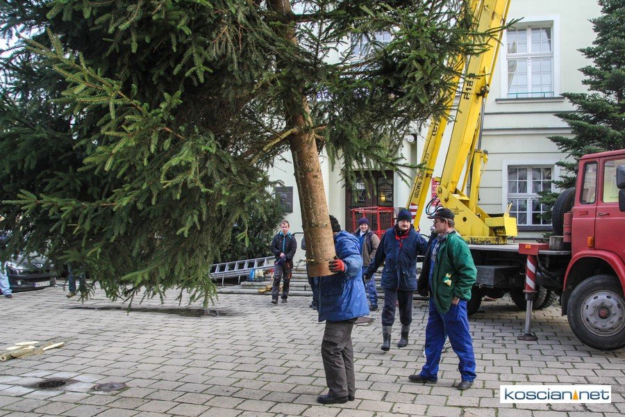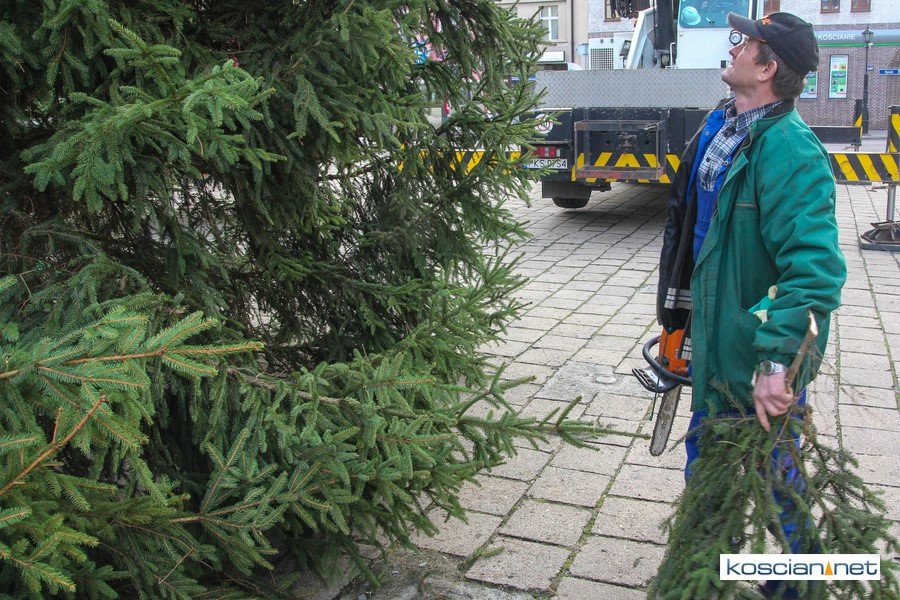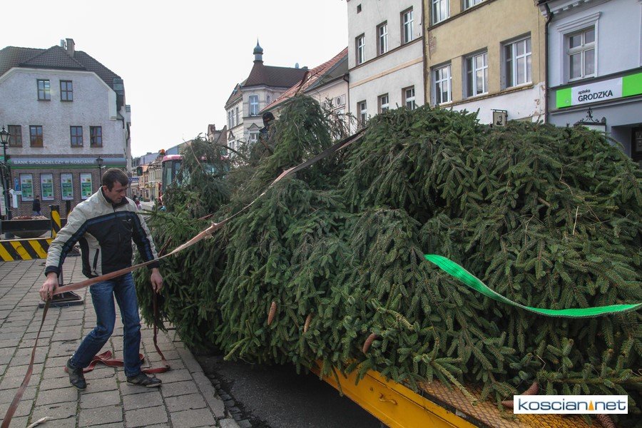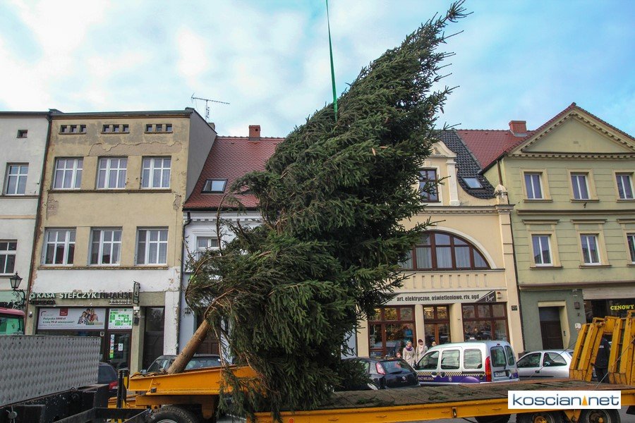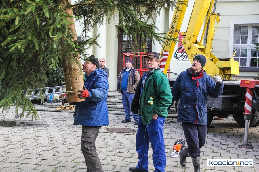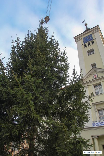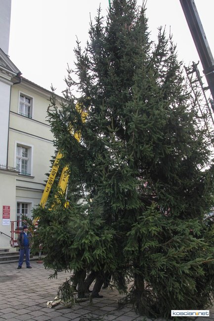 Ma dziesięć metrów wysokości i jak większość jej poprzedniczek pochodzi z leśnictwa Ziemin. Tradycyjnie wypatrzył ją pan Krzysztof z Kościańskiego Ośrodka Kultury, a z lasu wydobyła i do miasta przywiozła szesnastoosobowa ekipa. Po raz piąty bezpłatną pomoc zaoferowała firma Ewmar, której dźwig postawił choinkę do pionu. Po umocowaniu drzewka rozpoczęto jego strojenie siedmioma tysiącami światełek.