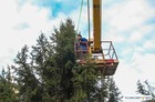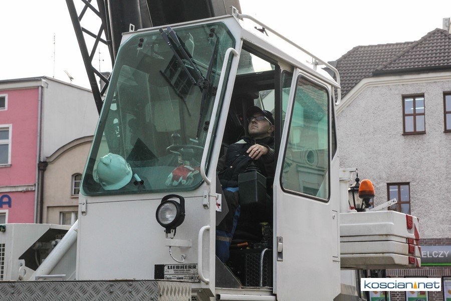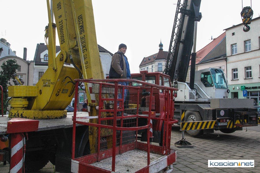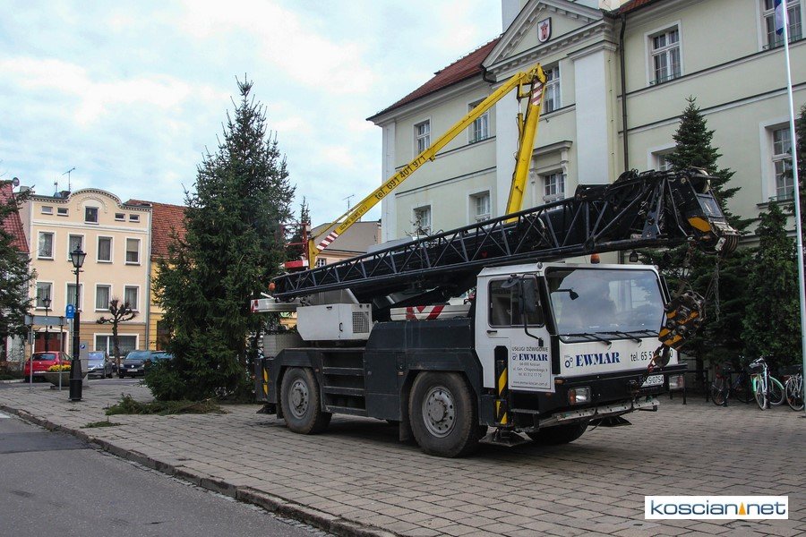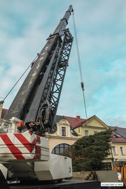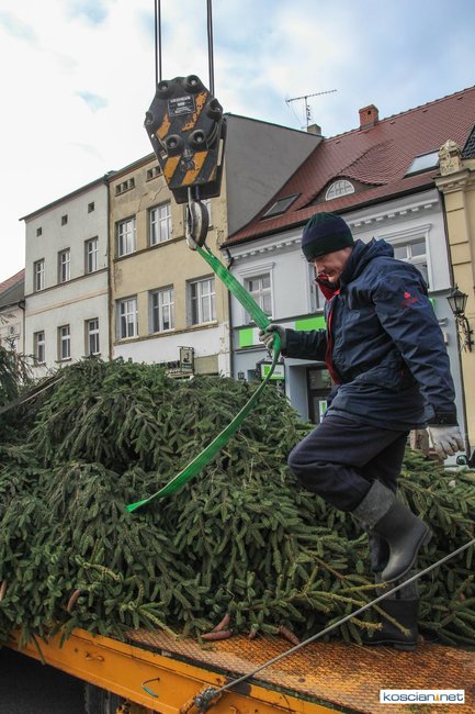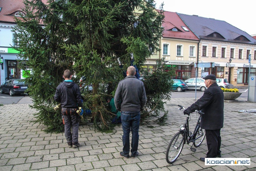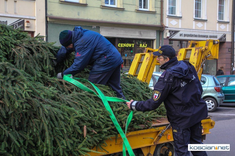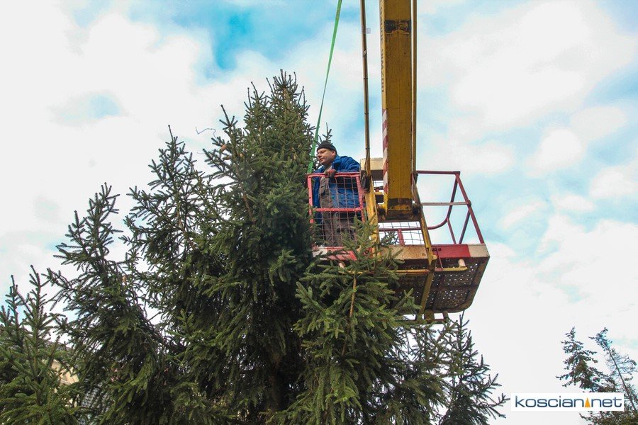 Ma dziesięć metrów wysokości i jak większość jej poprzedniczek pochodzi z leśnictwa Ziemin. Tradycyjnie wypatrzył ją pan Krzysztof z Kościańskiego Ośrodka Kultury, a z lasu wydobyła i do miasta przywiozła szesnastoosobowa ekipa. Po raz piąty bezpłatną pomoc zaoferowała firma Ewmar, której dźwig postawił choinkę do pionu. Po umocowaniu drzewka rozpoczęto jego strojenie siedmioma tysiącami światełek.
