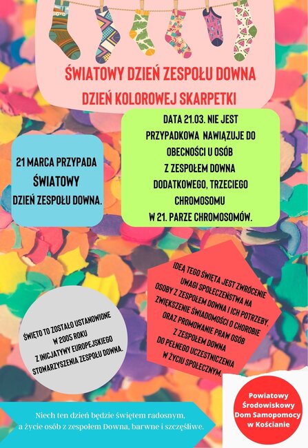 Jeśli skarpetki to dla Was za mało – załóżcie kolorowe ubrania. Kolory Światowego Dnia Zespołu Downa to granatowy i czerwony. Niech ten dzień będzie świętem kolorowym i radosnym, a życie osób z Zespołem Downa barwne i szczęśliwe!!! – czytamy w komunikacie Starostwa Powiatowego w Kościanie.