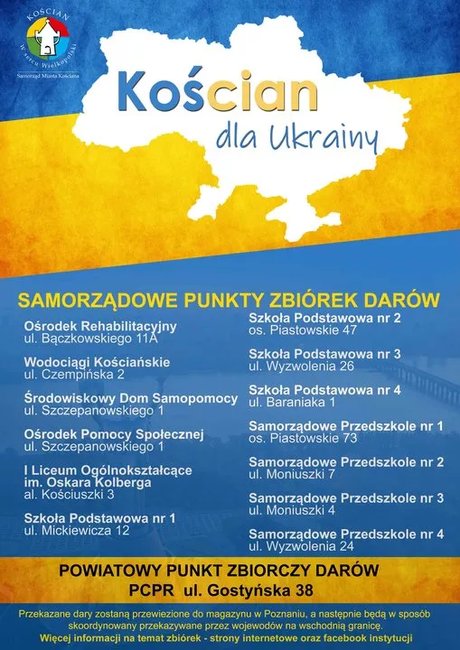 - Liczne apele o pomoc dla dotkniętych wojną obywateli Ukrainy spotkały się z ogromnym odzewem. Serdecznie dziękuję wszystkim kościaniakom za życzliwość, za wszystkie wspaniałe gesty oraz pomoc tak potrzebną ludziom dotkniętym wojną – mówi Piotr Ruszkiewicz, burmistrz Kościana. - Cały czas działają samorządowe punkty zbiórki.