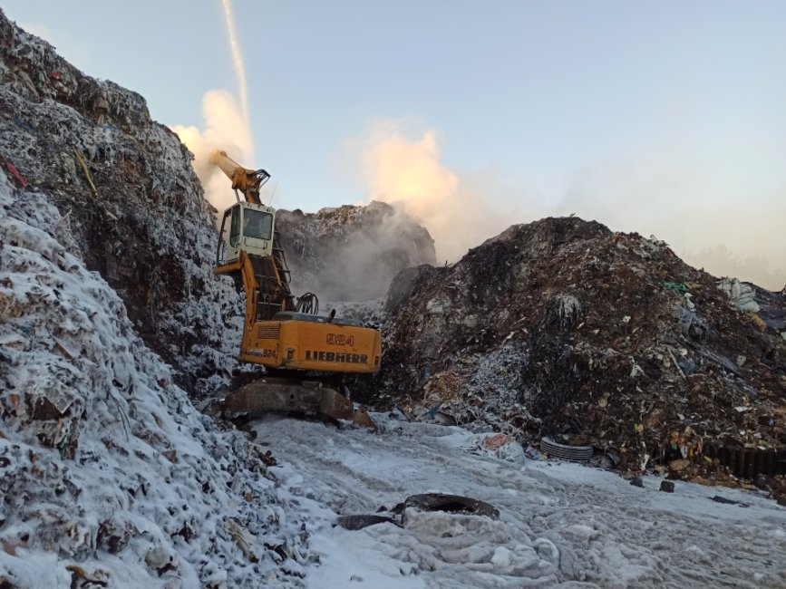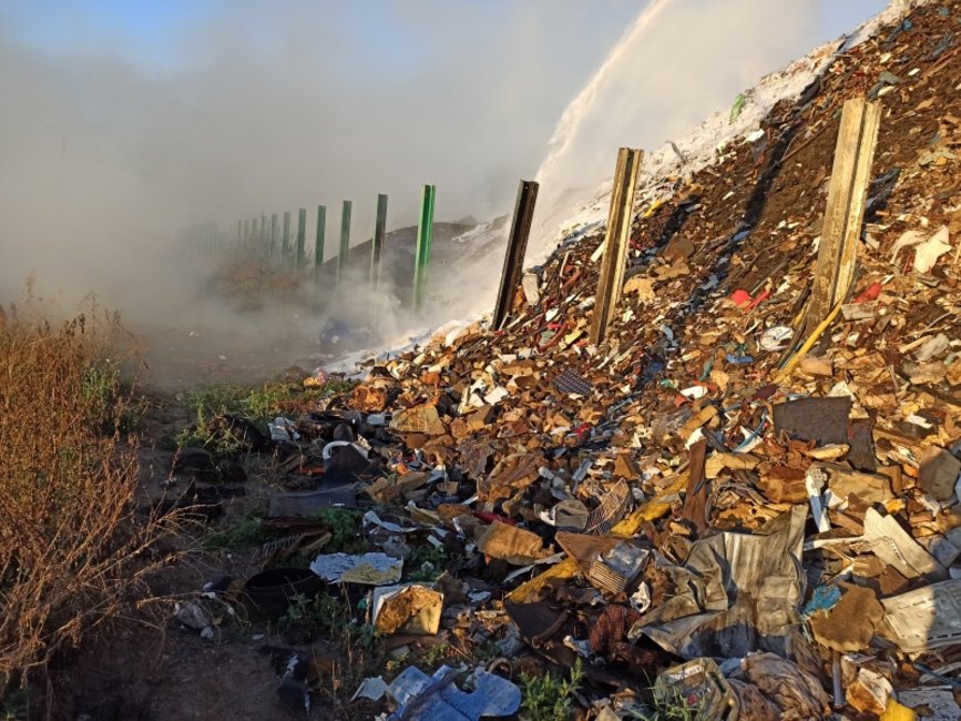 W czasie rozpoznania ustalono, że na wschodnim skraju placu składowego, w pobliżu torów kolejowych pali się sterta składowanych odpadów. Pożar rozprzestrzeniał się po powierzchni sterty – odpady szarpane - materiały gumowe po segregacji oraz tworzywa sztuczne.