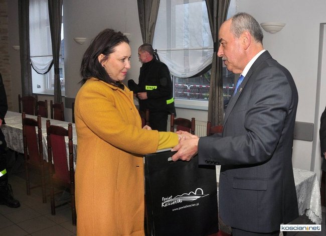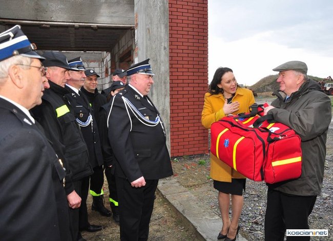 Andżelika Możdżanowska złożyła także krótką wizytę na budowie strażnicy OSP w Głuchowie. Przy porywistym wietrze spotkała się ze strażakami by złożyć im świąteczne życzenia oraz przekazać na ręce komendanta Jana Ratajczaka torbę PSP R1 zawierającą zestaw do udzielania pomocy przedmedycznej. Senator Andżelice Możdżanowskiej towarzyszyli: starosta Bernard Turski, prezes Zarządu Oddziału Gminnego PSP RP w Czempiniu Kazimierz Dembny oraz komendant gminny OSP Jan Kasperski.