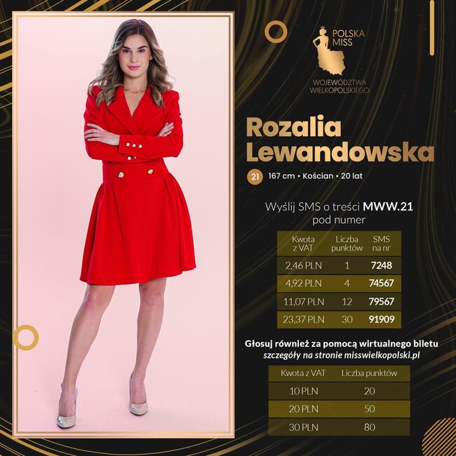 Oddając głos na Rozalię w konkursie na Miss Internautów Województwa Wielkopolskiego dajecie jej szansę na awans do TOP10 oraz przepustkę do ogólnopolskiego konkursu. Głosowanie trwa do 01 października 2022 (sobota) do godz. 22:00.