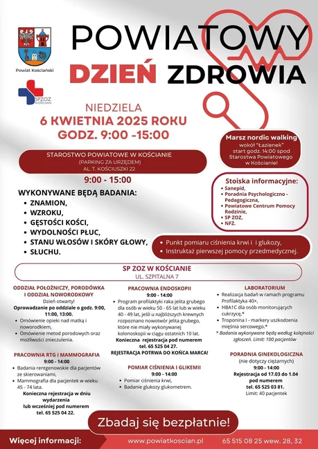Powiat Kościański i SP ZOZ w Kościanie zapraszają mieszkańców powiatu kościańskiego do udziału w bezpłatnych badaniach z okazji Światowego Dnia Zdrowia.
