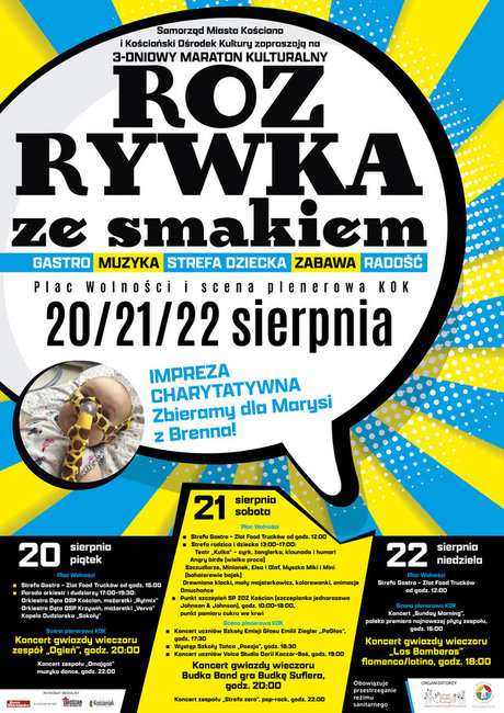 Cykl różnorodnych imprez odbywać się będzie na Placu Wolności i plenerowej scenie Kościańskiego Ośrodka Kultury. Na trzy dni zaparkują tu food trucki z różnorodnym jedzeniem. W piątek strefa gastronomiczna będzie czynna od godziny 15., a w sobotę i niedzielę od godziny 12. Poniżej program imprezy.