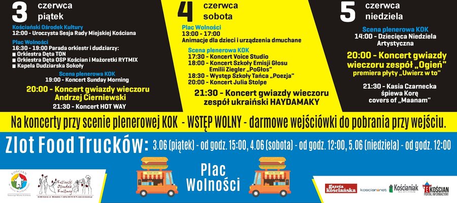 Poza sceną w Parku KOK bawić się będzie można także na Placu Wolności. W piątek wystąpią tam orkiestry dęte TON i OSP Kościan z Mażoretkami Rytmix i Kapela Dudziarska Sokoły, a w sobotę prowadzone będą animacje dla dzieci. Z kolei na boisku „Jedynki” stanie „Lunapark Happy End”.