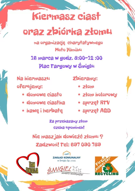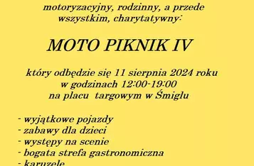 Tegoroczny, czwarty już Moto Piknik odbędzie się w niedzielę, 11 sierpnia, na Placu Targowym w Śmiglu, jednak pierwsze wydarzenie związane z tą dużą imprezą odbędzie się w sobotę, 16 marca. Tego dnia organizowana będzie zbiórka złomu oraz kiermasz ciast, z których dochód przeznaczony zostanie na organizację sierpniowej imprezy.