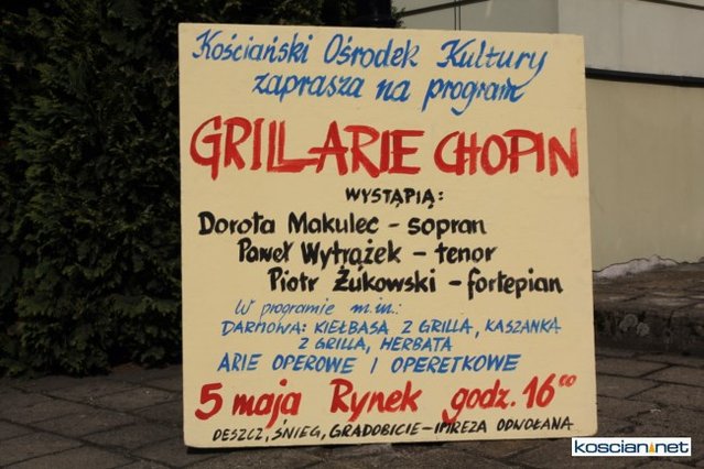 Imprezę zatytułowaną GRILL ARIE CHOPIN dopełniał duet konferansjerów, który w kabaretowej formie zapoznał konsumentów z definicjami kaszanki, kiełbasy i grilla oraz tłumaczył przesłanie imprezy wpisującej się w nieistniejący ministerialny projekt łączenia kultury i rolnictwa. Jedni się dziwili, inni bawili, a większość biła brawo.