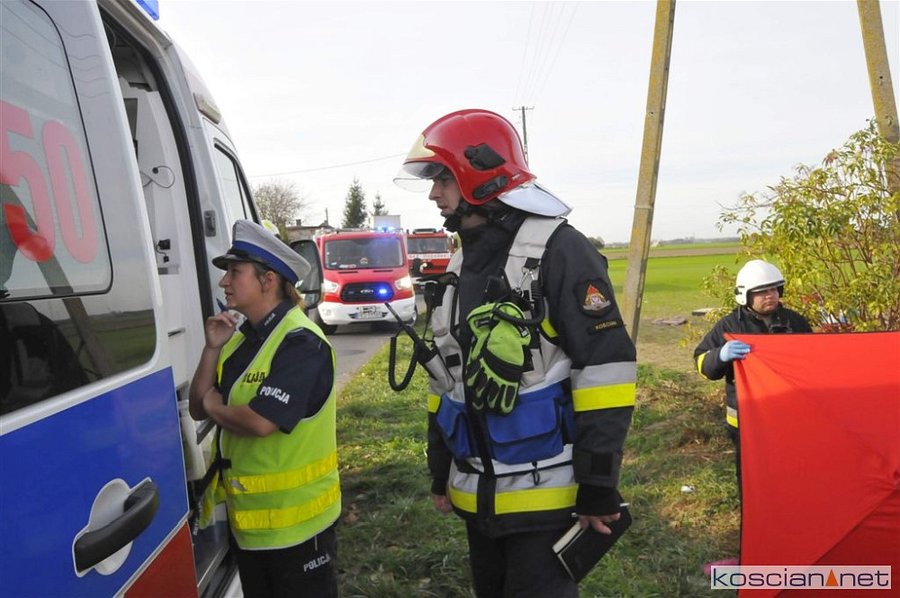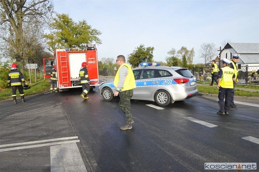 O godz. 14.29 Stanowisko Kierowania Komendanta Powiatowego PSP w Kościanie zostało poinformowane o wypadku drogowym, do jakiego doszło właśnie w tym miejscu. Ze zgłoszenia wynikało, że zderzyły się 2 samochody w tym jeden typu bus. Wiadomo było, rannych jest kilka osób a jedna z nich wypadła z któregoś samochodu. Pierwszy strażacki zastęp pojawił się o godz. 14.36. Na drodze wstrzymano ruch i zabezpieczono miejsce wypadku.