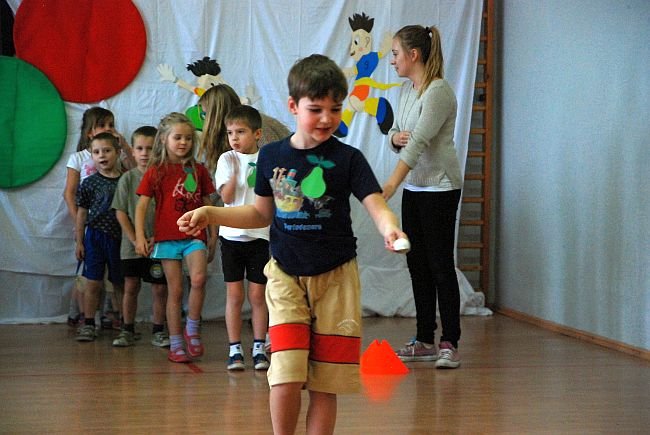 W środowe popołudnie szkolna aula zamieniła się na arenę sportowych zmagań. Przez dwie godziny pięcio- i sześciolatki rywalizowały w zawodach, ścigając się w rzędach. Biedronki, Rybki i Pszczółki zostały podzielone na sześć grup i oznaczone owocami: ananasy, banany, winogrona, truskawki, gruszki i marchewki. Na dobry początek każda z grup zaśpiewała piosenkę. Pszczółki wykonały utwór o surówce warzywnej, Biedronki o tym, dlaczego gruszka chce być chuda jak pietruszka, a Rybki o łakomczuchach i diecie. Na rozgrzewkę były też zabawy ruchowe w kole.