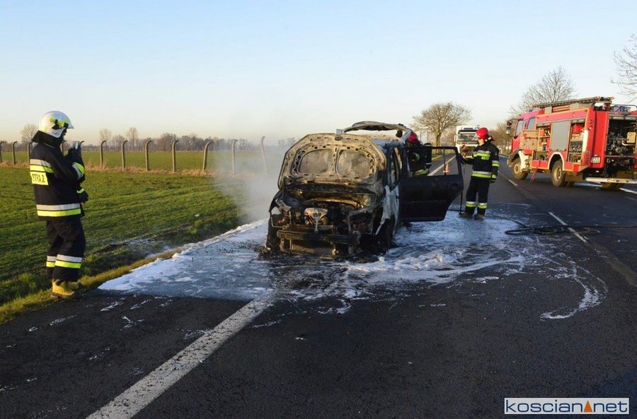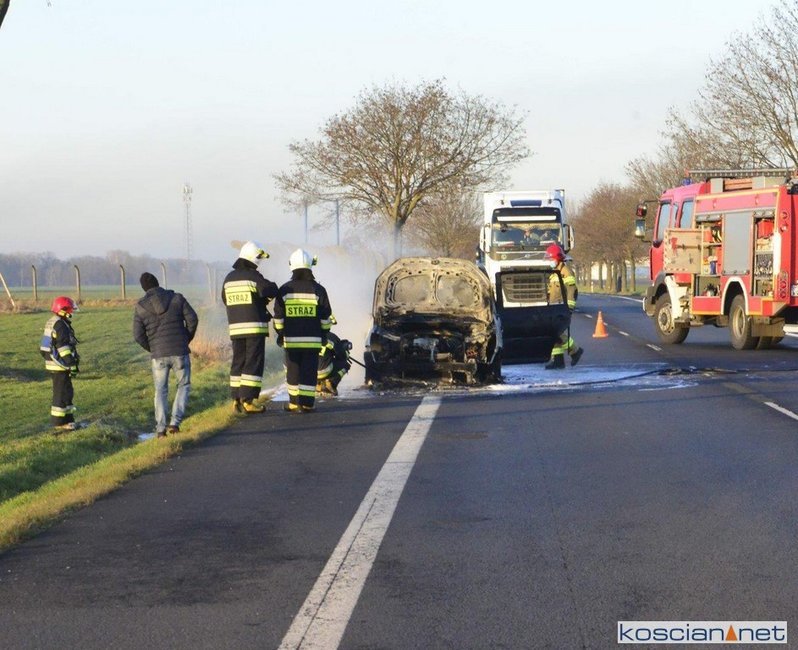 W środę, 30 grudnia, około godziny 14.40 straż pożarna przyjęła zgłoszenie o pożarze volkswagena na drodze pomiędzy Kawczynem, a Jarogniewicami. Gdy na miejsce dotarli strażacy samochód był cały w płomieniach. Na szczęście osoby podróżujące volkswagenem zdążyły bezpiecznie opuścić pojazd. Prawdopodobną przyczyną pożaru było zwarcie instalacji elektrycznej. W akcji uczestniczyli strażacy z JRG Kościan i OSP Kościan.