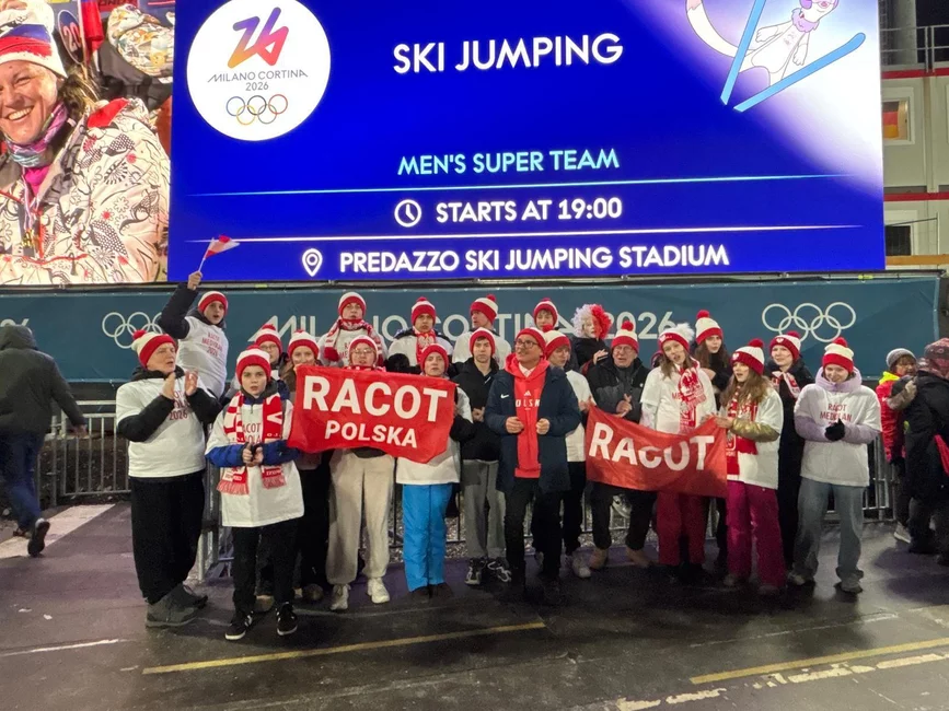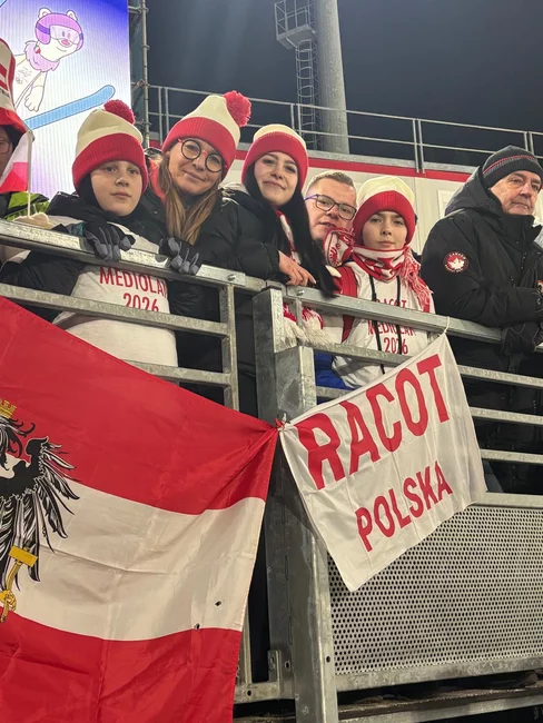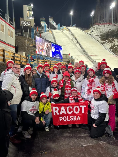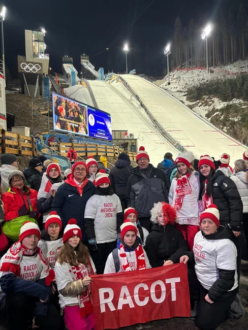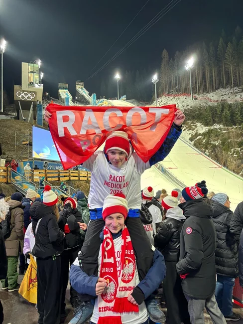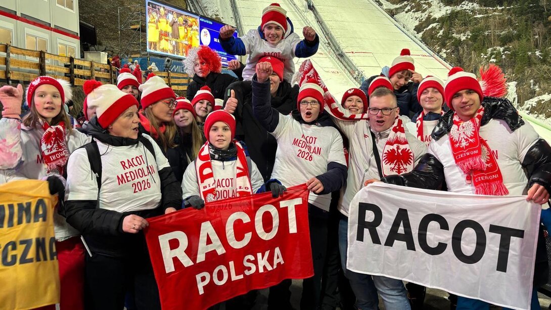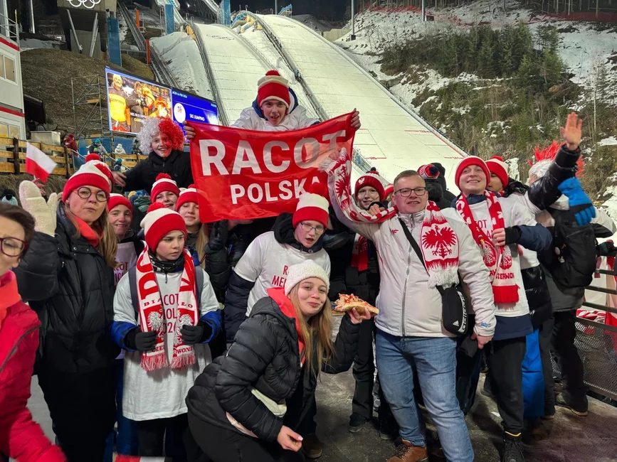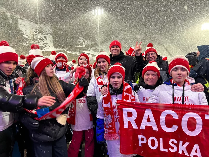 Na dużej skoczni w Predazzo Paweł Wąsek i Kacper Tomasiak wywalczyli srebrny medal w konkursie duetów. Wśród tysięcy kibiców nie zabrakło wyraźnej, doskonale widocznej grupy z Racotu, która swoim dopingiem niosła Polaków do sukcesu.