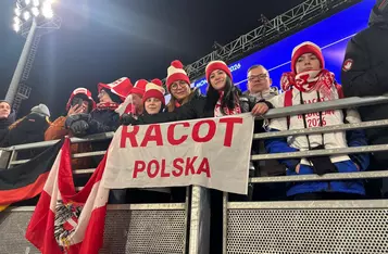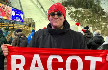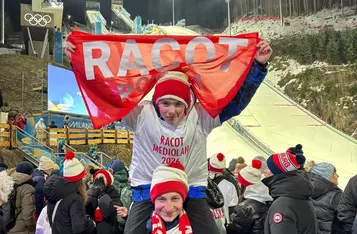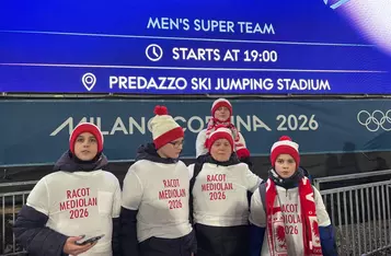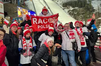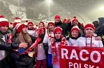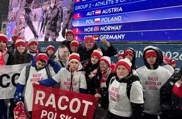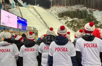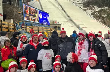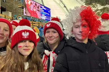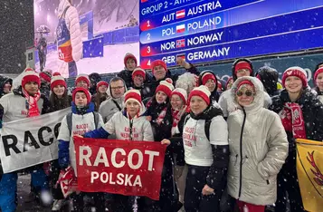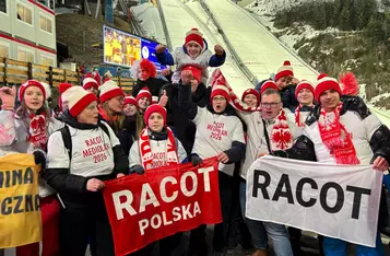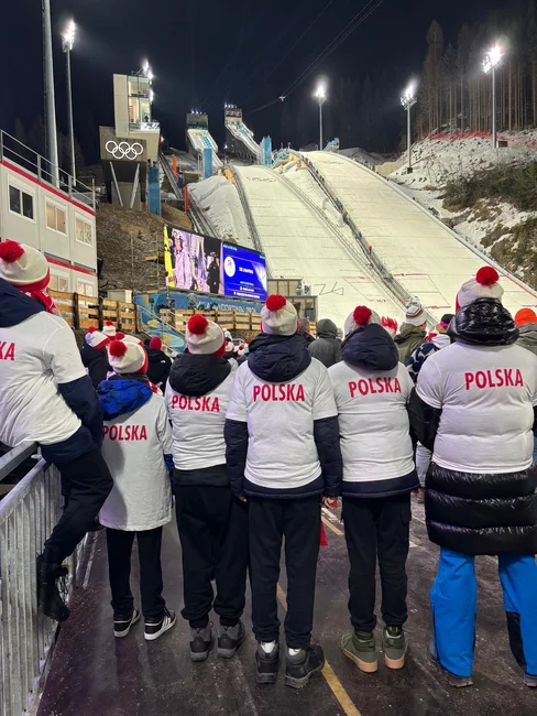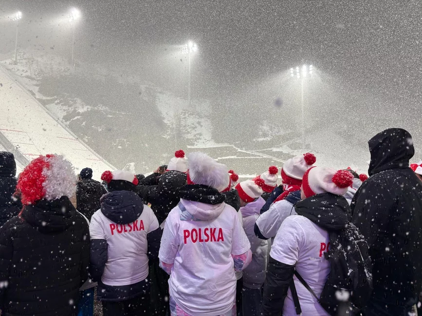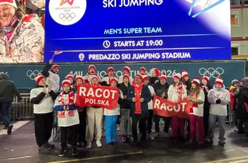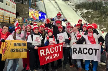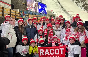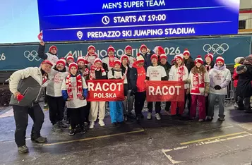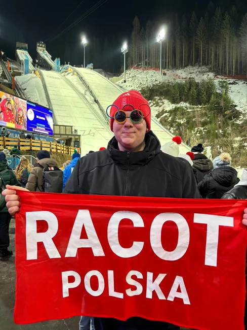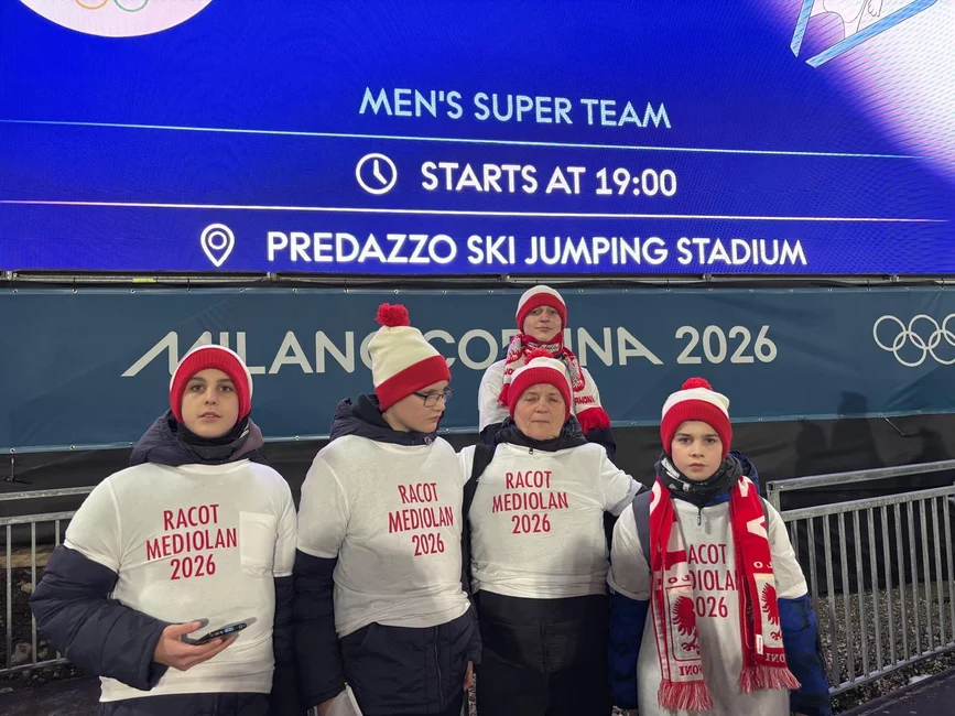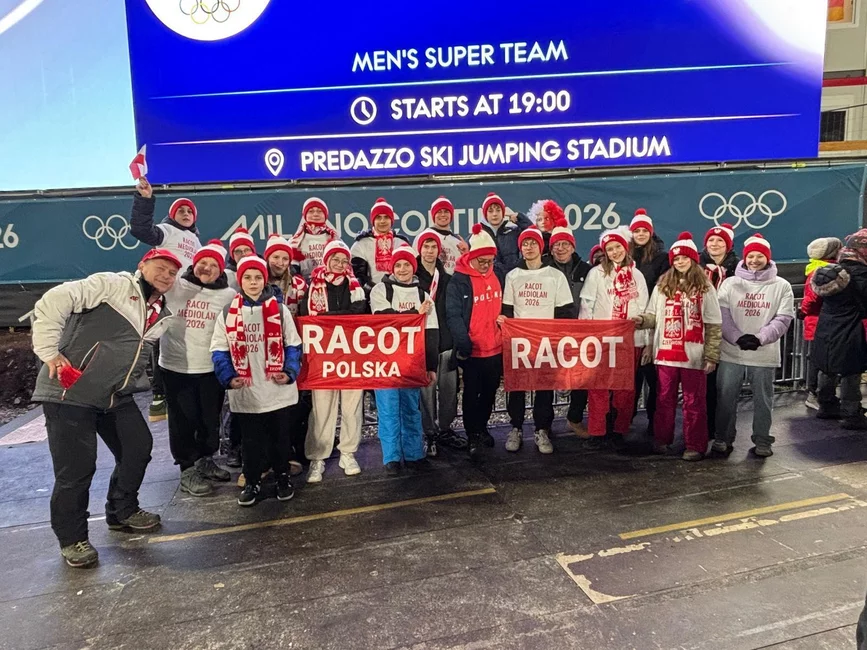 Na dużej skoczni w Predazzo Paweł Wąsek i Kacper Tomasiak wywalczyli srebrny medal w konkursie duetów. Wśród tysięcy kibiców nie zabrakło wyraźnej, doskonale widocznej grupy z Racotu, która swoim dopingiem niosła Polaków do sukcesu.