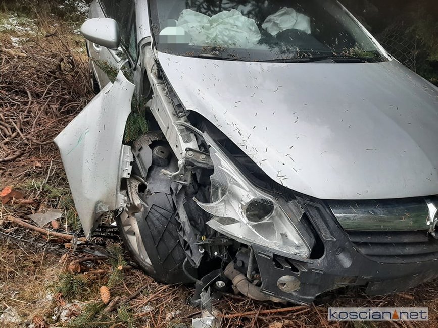 Jadąca w kierunku Szczodrowa, 27-letnia mieszkanka gminy Kościan, straciła panowanie nad oplem corsą. Samochód zjechał do rowu ścinając trzymetrowe drzewo i uszkadzając płot posesji. Kierująca samodzielnie opuściła pojazd. Na badania do kościańskiego szpitala przewieźli ją własnym samochodem krewni.