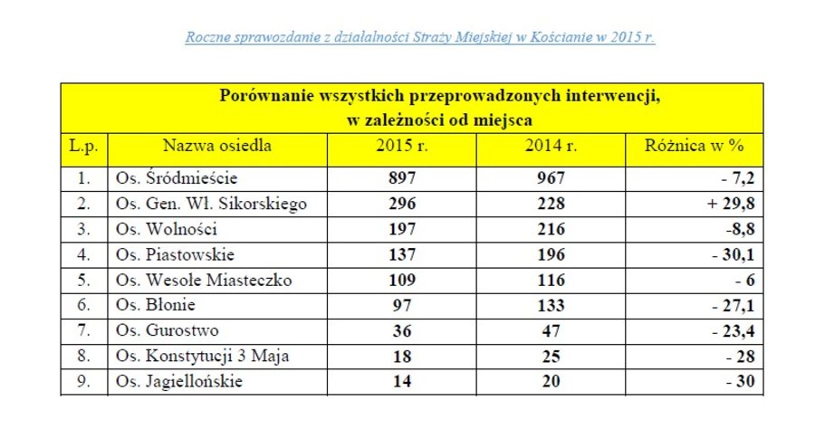 Rada Miejska Kościana przyjęła sprawozdanie z działalności Straży Miejskiej w roku 2015. W okresie tym w SM pracowało siedmioro funkcjonariuszy i pracownik administracyjny. Od poniedziałku do piątku Straż Miejska pracowała w systemie dwuzmianowym (7 – 15 i 15 – 23). W zależności od potrzeb funkcjonariusze patrolowali miasto także w weekendy na drugiej zmianie. Trzecia zmiana wprowadzana była w piątki w godz. 18 – 2 i soboty w godz. 20 – 4.