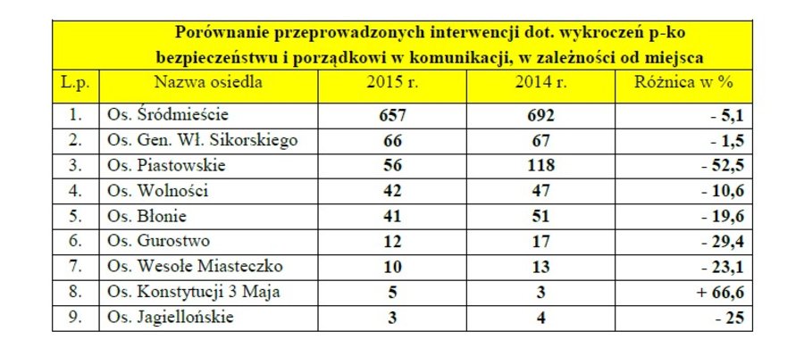 W 2015 roku Straż Miejska przeprowadziła 1802 interwencje. 441 z nich podjęto po sygnałach od mieszkańców i instytucji. W obu przypadku obu wskaźników zanotowano spadek w stosunku do roku 2014 (1951 interwencje, z czego 485 od mieszkańców i instytucji). Funkcjonariusze samodzielnie wykonali 5 462 kontroli i innych zadań. Patrolowali także miasto wspólnie z policjantami. Prowadzili cykliczne akcje. Nadzorowali także skazanych skierowanych przez sąd na prace społeczne w ramach kary ograniczenia wolności. Do Straży Miejskiej trafiło łącznie 37 osób – 32 mężczyzna i 5 kobiet. Dodatkowo 22 osoby pozostały z lat poprzednich. Skazani przepracowali na rzecz miasta 2 680 godzin.