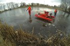 Kościańscy strażacy odbyli ćwiczenia na lodzie testując katamaran systemu woda-lód.
