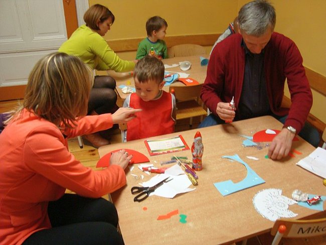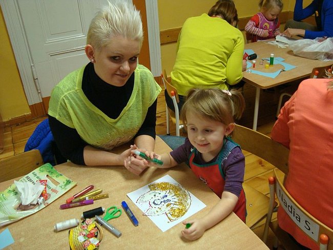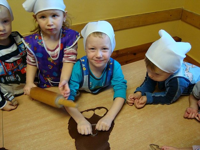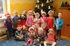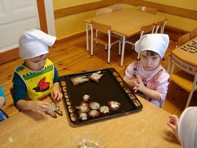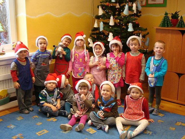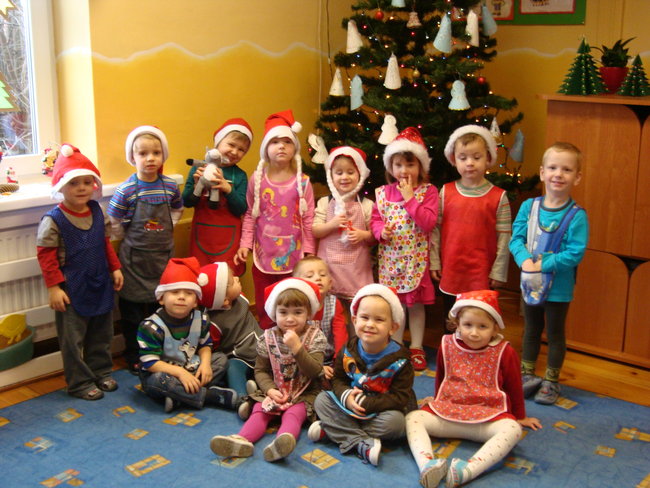 Najpierw przygotowały dla swoich rodziców upominki- choinki ze złotymi bombkami. Potem zajęły się wypiekami. Wałkowały ciasto i wykrawały foremkami pierniki w kształcie: reniferów, choinek, gwiazdek, serduszek. Po upieczeniu lukrowały i dekorowały kolorowym maczkiem. Do przedszkola dzieci zaprosiły rodziców, by wspólnie ozdobić choinkę. Na świerkowych gałązkach pojawiły się przepiękne anioły w brokatowych sukienkach, a Mikołaje z białymi brodami i wąsami ozdobiły okna. Dzieci z niecierpliwością czekają na święta, a szczególnie na prezenty, które przyniesie im Mikołaj podczas przedstawienia ,,W zimowej krainie” przygotowanego dla rodziców.