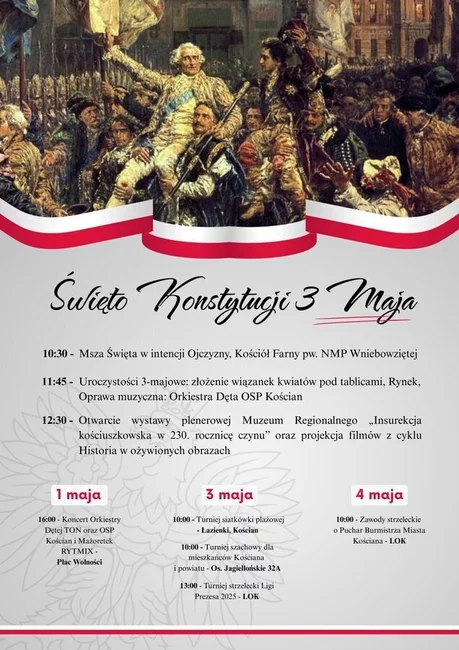 11:45 - Uroczystości 3-majowe: złożenie wiązanek kwiatów pod tablicami na Rynku, oprawa muzyczna Orkiestra Dęta OSP Kościan
