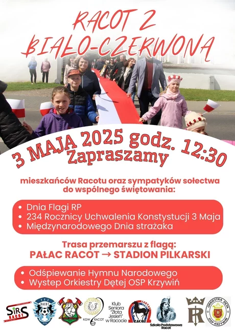 12:30 – przemarsz z ponad stumetrową flagą z pałacu na stadion piłkarski. Wspólne odśpiewanie hymnu, koncert Orkiestry Dętej OSP Krzywiń.