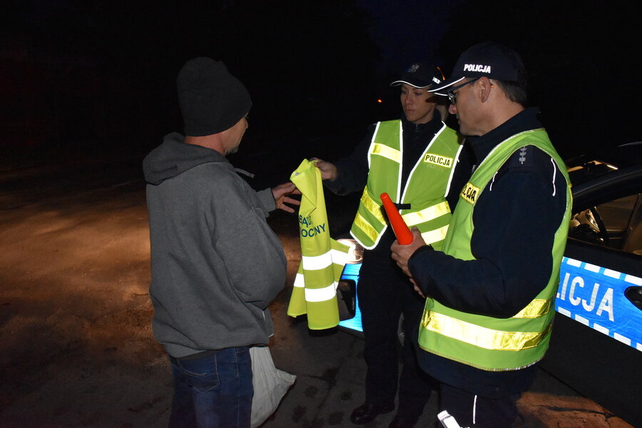 - Słabe oświetlenie dróg oraz ubrania w ciemnych kolorach sprawiają, że piesi są słabo widoczni dla kierowcy samochodu. Elementy odblaskowe kilkukrotnie zwiększają tą widoczność – mówi Jarosław Lemański, oficer prasowy KPP w Kościanie. – Podczas działań funkcjonariusze przekazywali pieszym elementy odblaskowe i w praktyczny sposób pokazywali o ile bardziej widoczna jest osoba z elementem odblaskowym.