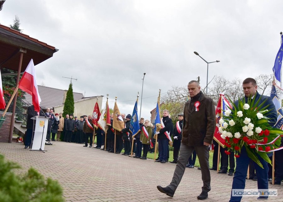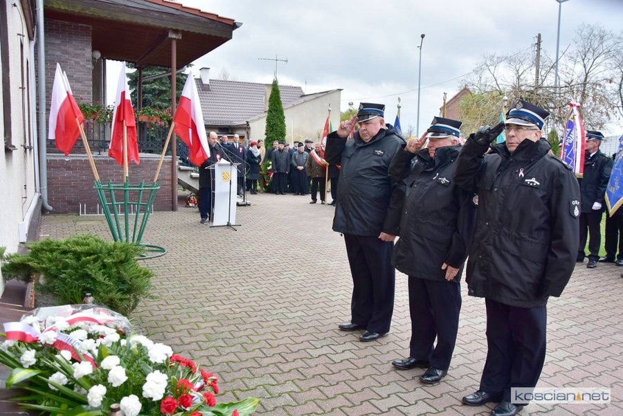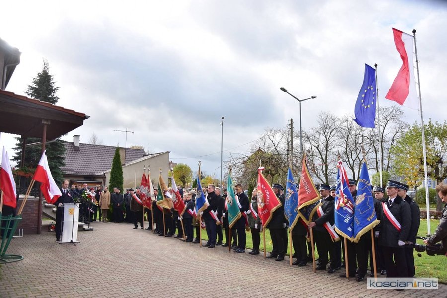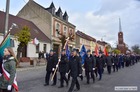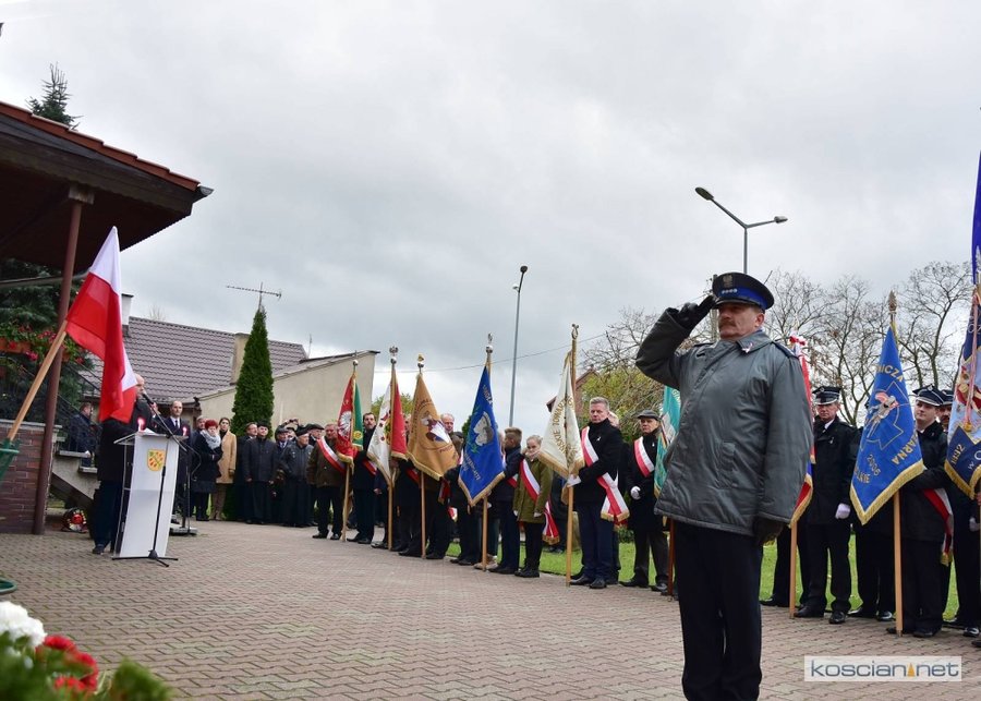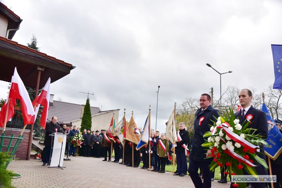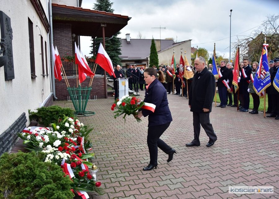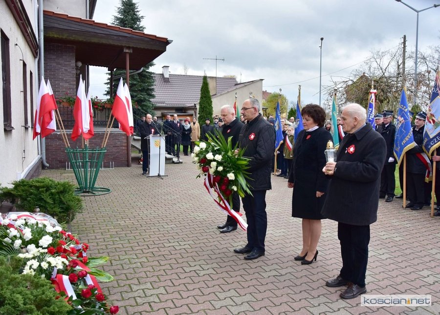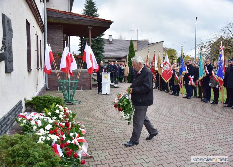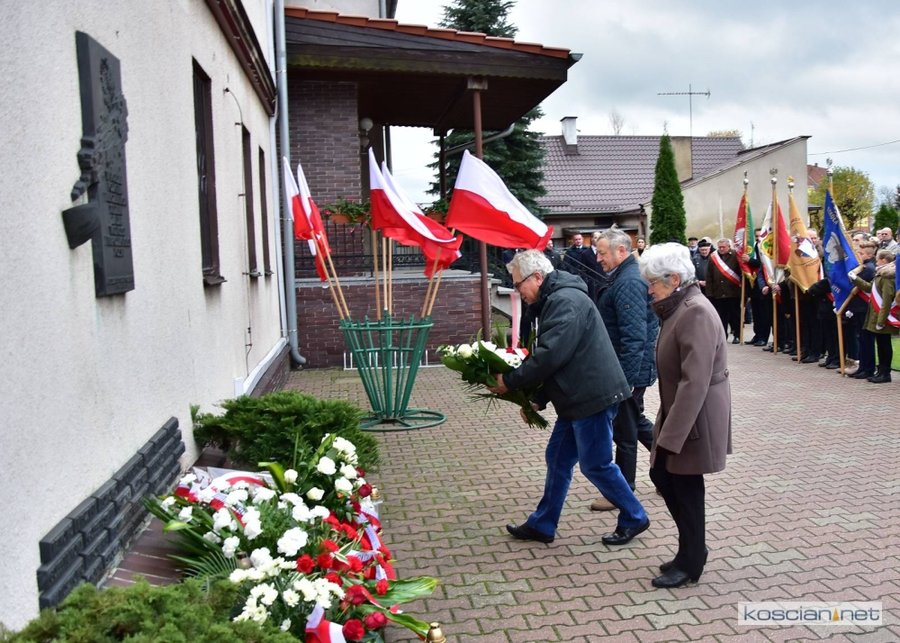 Po mszy uczestnicy uroczystości i poczty sztandarowe przemaszerowały przed Urząd Gminy, gdzie przy tablicy upamiętniającej bohaterów i ofiary pierwszej i drugiej wojny światowej złożono kwiaty.