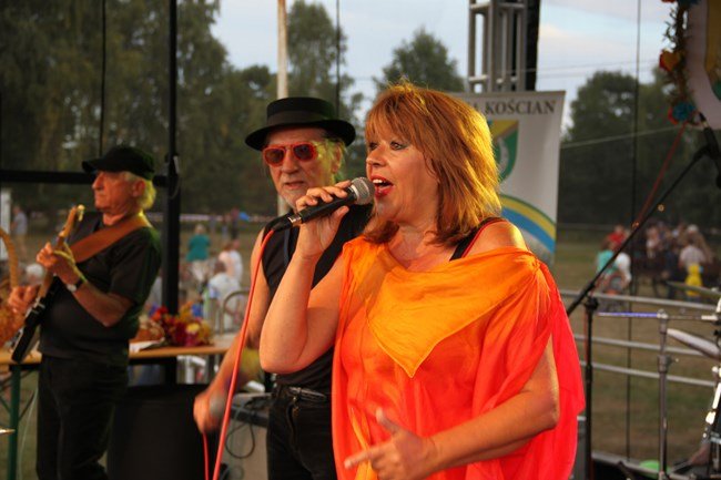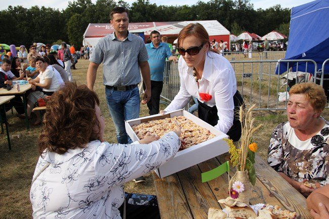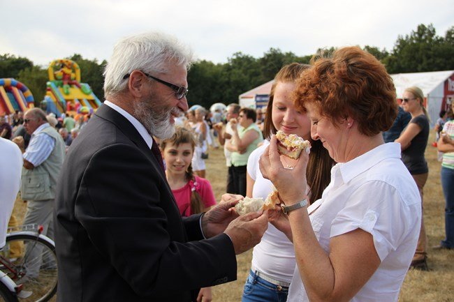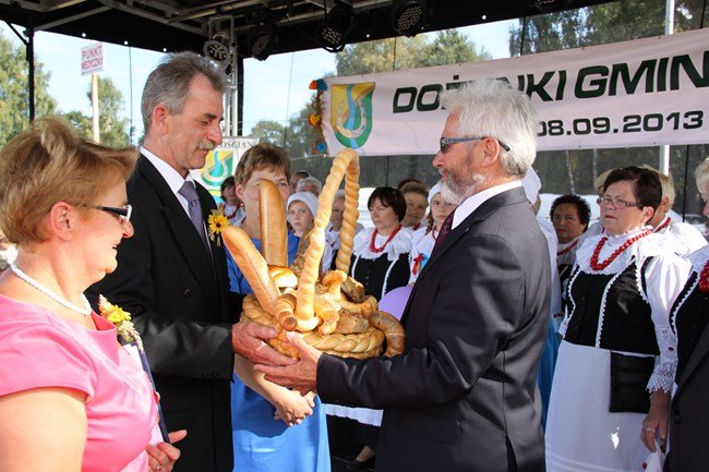 Starostami dożynek byli: Jolanta Beszterda i Zdzisław Mądry, którzy wręczyli wieniec dożynkowy i chleb wójtowi Henrykowi Bartoszewskiemu i Janowi Szczepaniakowi, przewodniczącemu Rady Gminy Kościan.