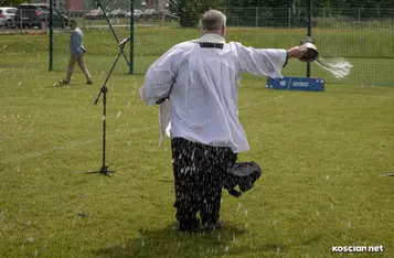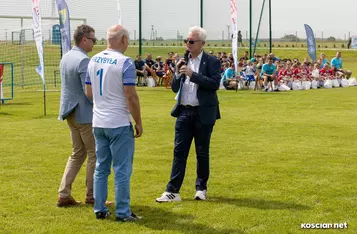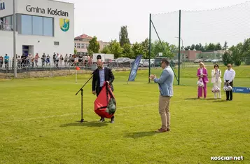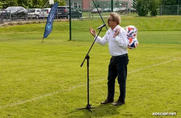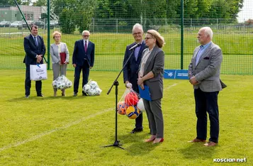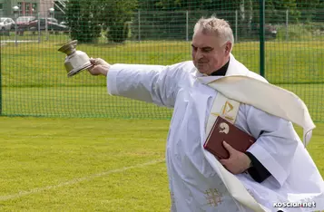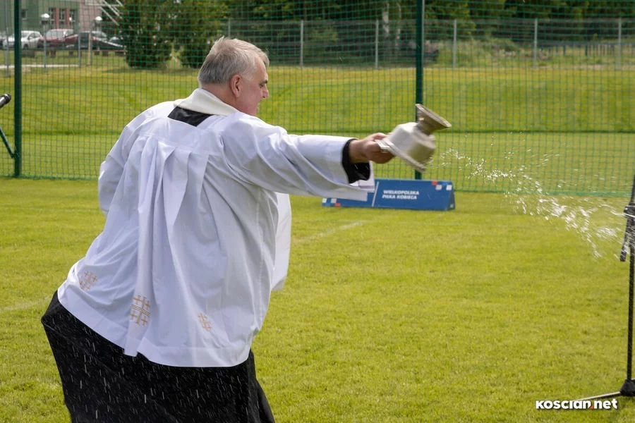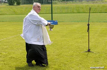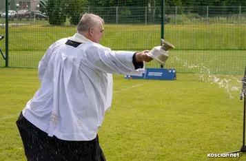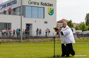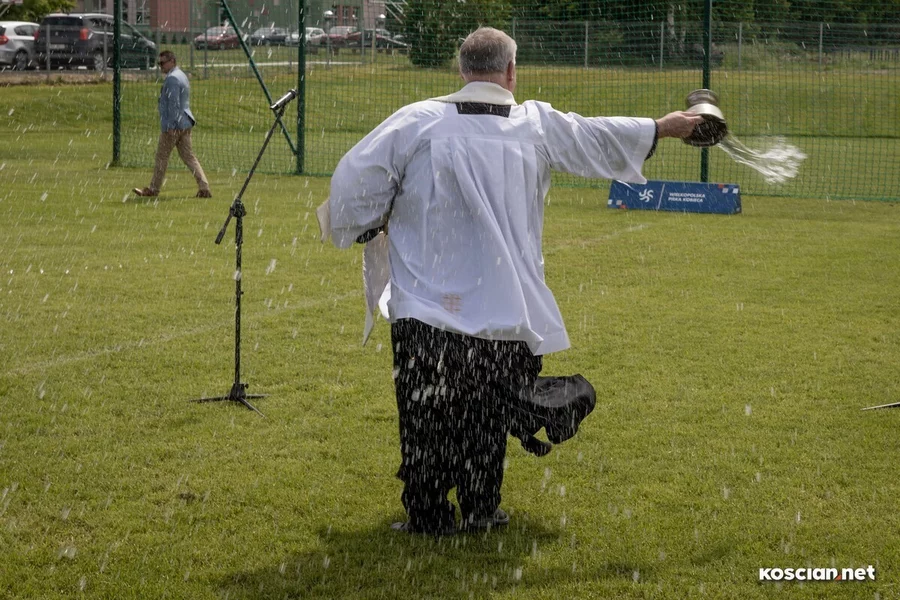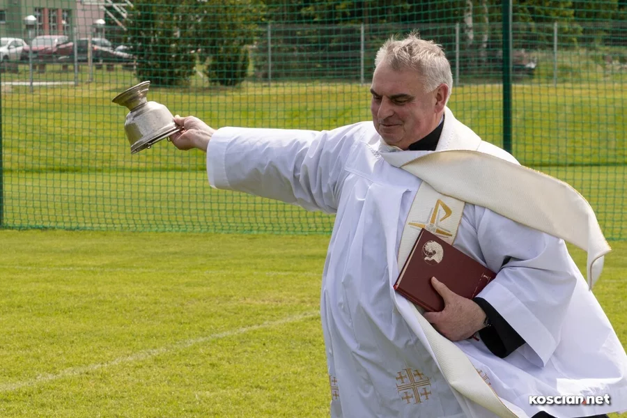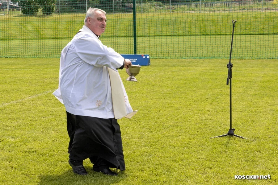 Po przecięciu symbolicznej wstęgi nastąpiło nietypowe poświęcenie obiektu. Proboszcz miejscowej parafii, ks. Jacek Markowski, nie użył bowiem kropidła, a wykonując kilka obrotów rozlał wodę święconą na boisku.