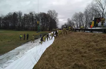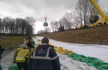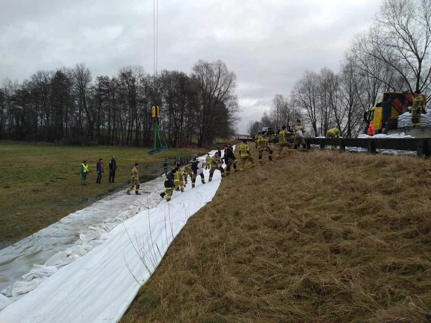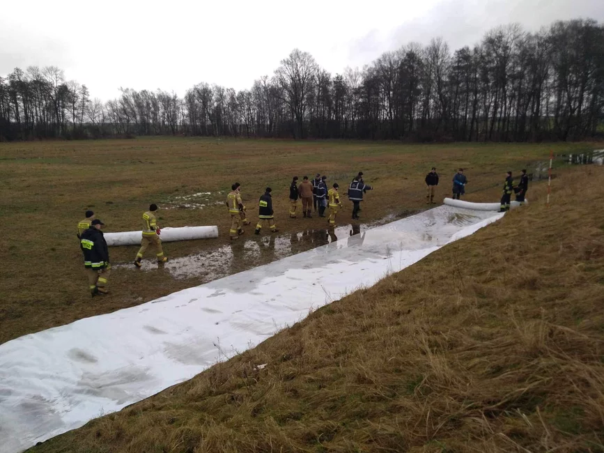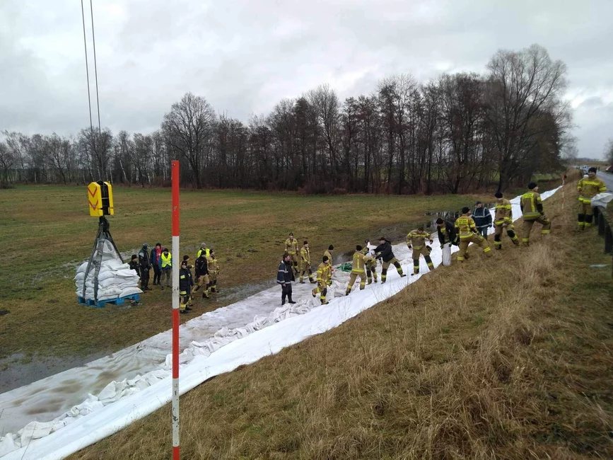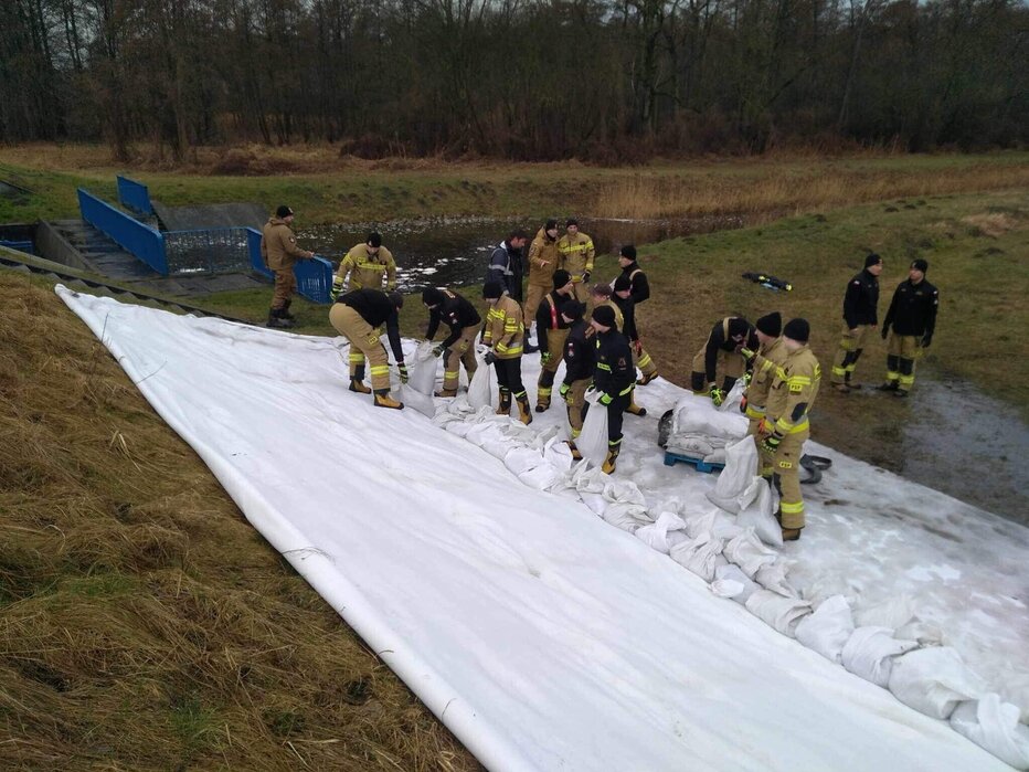 Trwa umacnianie skarpy zapory czołowej zbiornika Wonieść. Na miejscu pracuje ponad stu strażaków z Kościana, Poznania i powiatu kościańskiego.