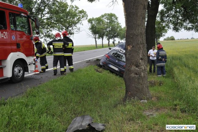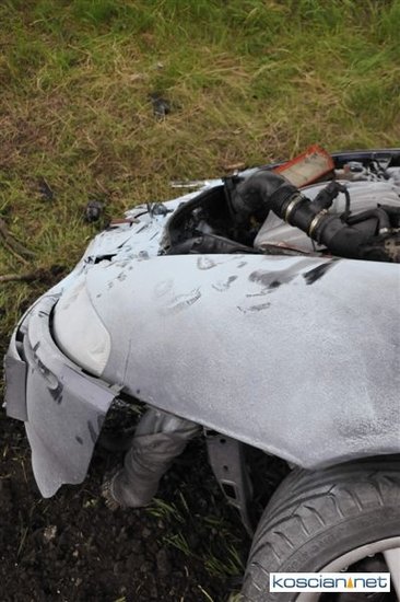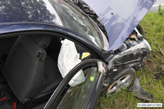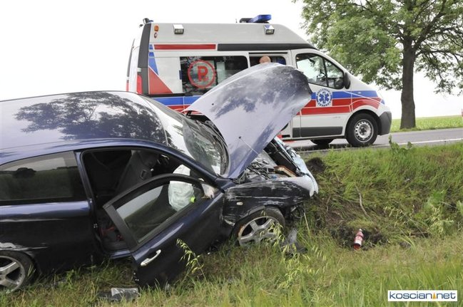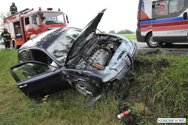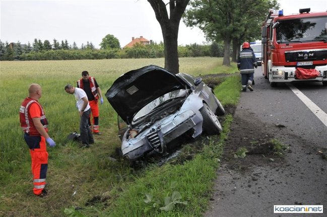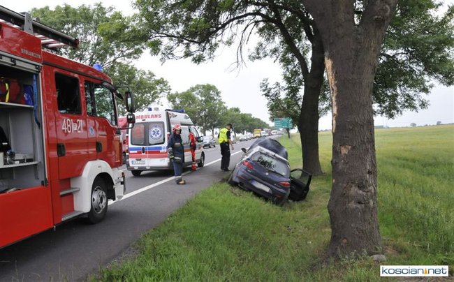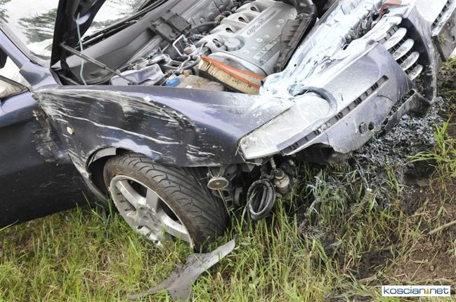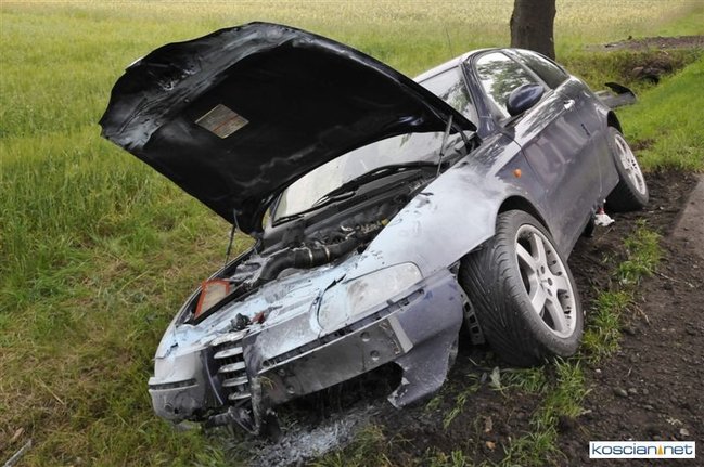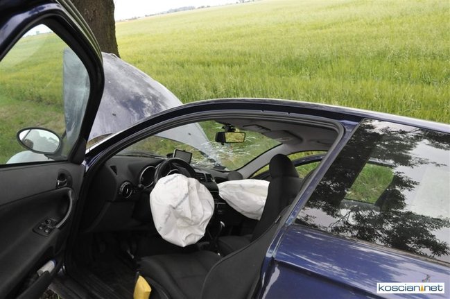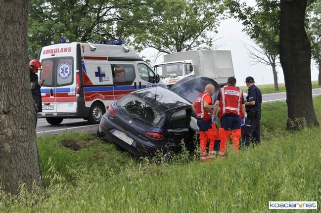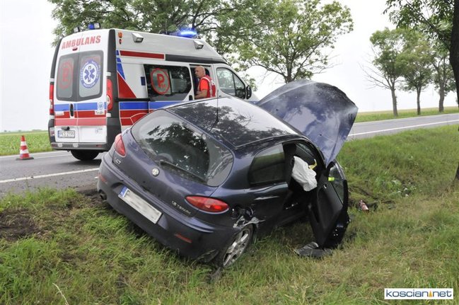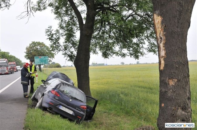 Do kolizji doszło dziś około godziny 15.50 na drodze krajowej nr 5 tuż za Kościanem w kierunku na Leszno. Alfa romeo zjechała z drogi do rowu, z którego po uderzeniu w przepust wyleciała w górę i ocierając się podwoziem o przydrożne drzewo spadła na koła przed kolejnym drzewem. Kierowca alfy wyszedł ze zdarzenia bez szwanku.