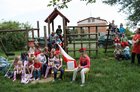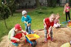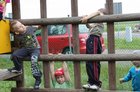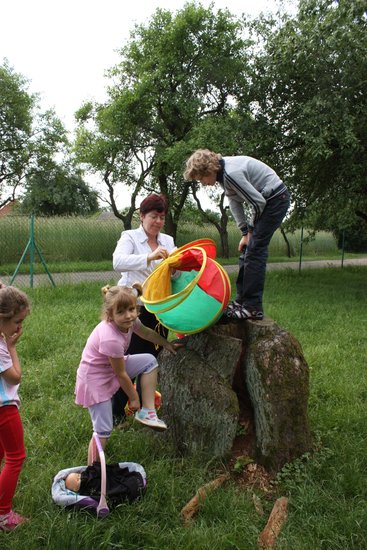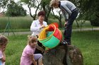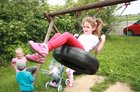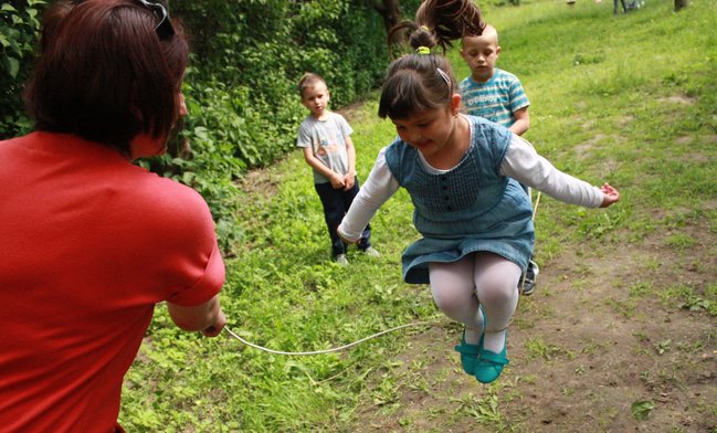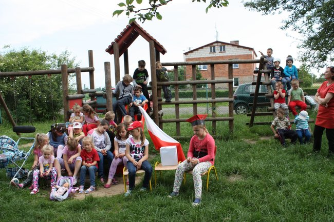 Jedna z przedszkolnych dziewczynek siada w tym czasie na huśtawce i buja się wysoko. Pachnie bez, śpiewa skowronek, świeci słońce.