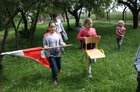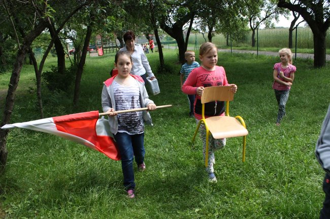 W piaskownicy toczy się wielka budowa. Królują przedszkolaki. Tu, gdzie kiedyś był szkolny warzywniak teraz jak piłeczka w rytm sznurowej skakanki odbija się dziewczynka w białych rajstopkach. Na huśtawkę wskakuje Roksana. Wybija się mocno, buja szybko i nagle zeskakuje. Tu nie ma dzwonka, a w każdym razie się go nie używa. Po co dzwonić? Wystarczy powiedzieć, że czas na wyjście, albo powrót do szkoły. Tym razem część lekcji odbędzie się po prostu w sadzie, i granica między lekcją, a przerwą zaciera się jeszcze bardziej. Ktoś przynosi flagę, ktoś krzesełka. Ola dostaje krakowską czapkę, a Oliwia pożyczoną od jednego z maluchów z napisem POLSKA. Cztero, pięcio, sześcio-, siedmio- i dziewięciolatki cichną, i siadają na zjeżdżalni, wieży, i drabinkach.