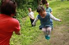 - Może się przeniosę... - odpowiada. Na razie obaj są w realu. Lubią się sprzeczać. Huśtawki opanowały dziewczęta. Na jednej Roksana, na drugiej pięciolatka z przedszkola. Na karuzeli dziewczynka w leginsach w różowe groszki trzyma sztywno nogę opartą o rękę koleżanki. Zdrapała strupek i dwa groszki zalały się czerwienią krwi. Słońce przebija przez liście jabłoni i oślepia dziewczynkę kręcącą skakanką. Pani Basia rozwija materiałowy tunel i linowe drabinki na trawie, i zaraz stają tam obok siebie i przedszkolaki, i uczniowie. Rodzinnie...