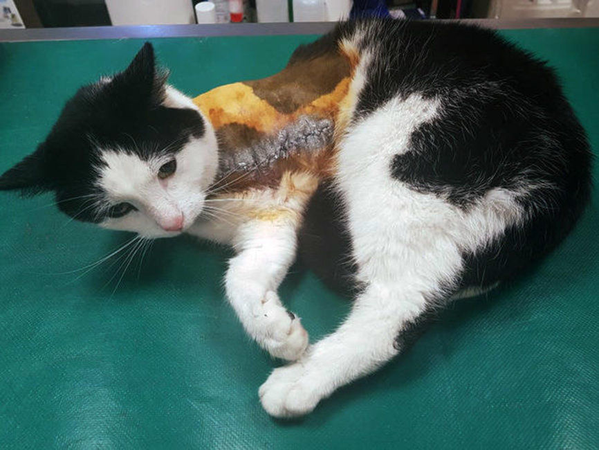 W wyniku postrzału kości oraz staw łokciowy zostały całkowicie zniszczone... Dobrze, że śrut zatrzymał się na miąższu wątroby, omijając struktury znajdujące się w klatce piersiowej. Gdyby śrut dostał się dalej, kotki nie dałoby się uratować. Po ustabilizowaniu konieczna była amputacja łapy. Nie było chwili do stracenia. Kotka jest już po operacji, jej stan jest stabilny. Dzielni weterynarze uratowali jej życie, niestety przez głupotę jakiegoś potwora kicia straciła łapkę...