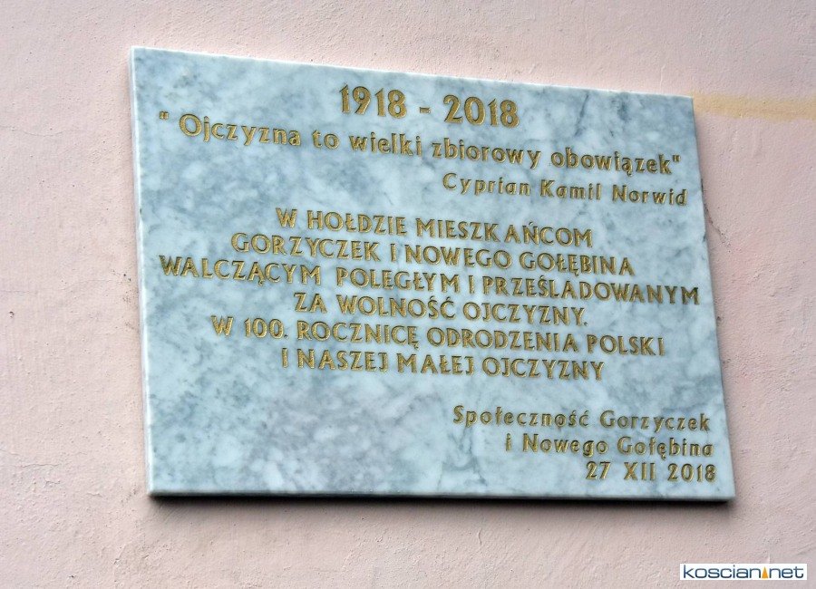 Mieszkańcy Gorzyczek i Nowego Gołębina na zabytkowym budynku kaplicy w Gorzyczkach umieścili 30 grudnia 2018 r. tablicę pamiątkową w 100 rocznicę odzyskania niepodległości w hołdzie walczącym i poległym za wolność mieszkańcom obu wsi . Tablicę odsłonił burmistrz gminy Konrad Malicki w asyście sołtysów Andrzeja Wawera z Gorzyczek oraz Piotra Mylki z Nowego Gołębina. Poświęcenia dokonał. proboszcz Czempinia ks. Andrzej Wojciechowski oraz proboszcz ze Starego Gołębina ks. Błażej Barczak.