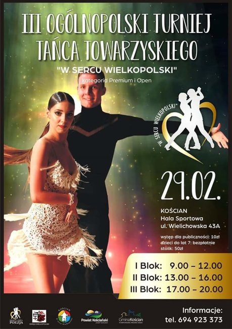 W sobotę, 29 lutego, o godz. 9., w hali sportowo-widowiskowej ZSP w Kościanie rozpoczął się III Ogólnopolski Turniej Tańca Towarzyskiego "W sercu Wielkopolski". W programie trzy bloki taneczne: pierwszy w godz. 9.00-12.00, drugi w godz. 13.00-16.00 i trzeci w godz. 17.00-20.00. Wstęp dla publiczności: 10 zł. Dzieci do lat siedmiu bezpłatnie.