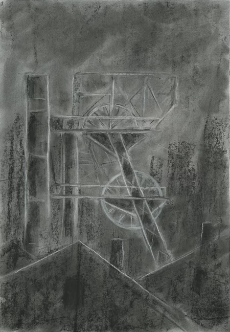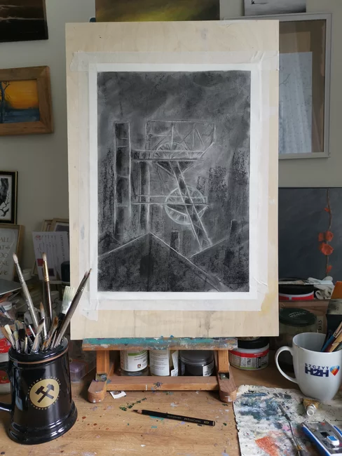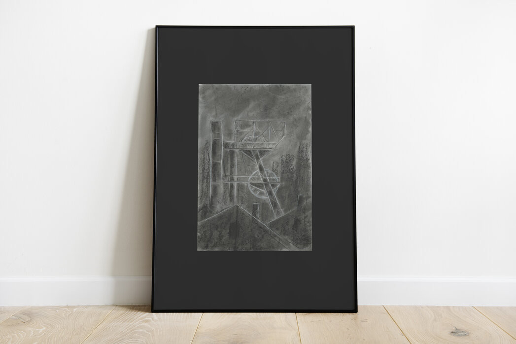 Przedmiotem aukcji na Allegro Lokalnie jest rysunek węglem na podobraziu papierowym zatytułowany „Szyb”. Podobrazie to papier żeberkowy Ingres o gramaturze 160 gsm i rozmiarze 45,5x32,5 cm, obszar pokryty węglem to około 42x30cm. Do rysunku dołączony będzie certyfikat autentyczności.