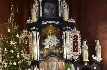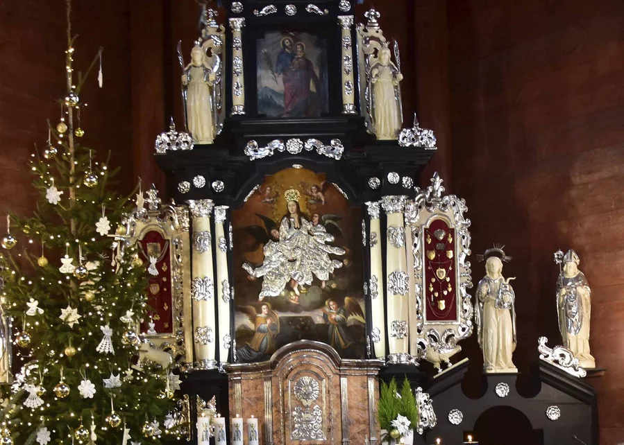 Przyznam, że nie jestem fanem odświeżonego wyglądu ołtarzu w Starym Gołębinie. Wcześniej cały był w kolorze kości słoniowej. Teraz wydaje mi się, że ten mocno ciemny kolor nie współgra ani z drewnianymi ścianami kościoła, ani z jasnymi elementami. Dodatkowo srebrzone elementy zalatują tandetą. Tabernakulum też z wyglądu pasuje zupełnie do niczego. Jest ktoś w stanie wytłumaczyć taką decyzję renowatorów? Zakładam, że za obranym kierunkiem nie stał raczej proboszcz, tylko konserwator zabytków. Czy ołtarz w tych barwach odzwierciedla jego pierwotny wygląd, a to właśnie poprzednie malowanie było ahistoryczną abominacją, której należało się jak najprędzej pozbyć?