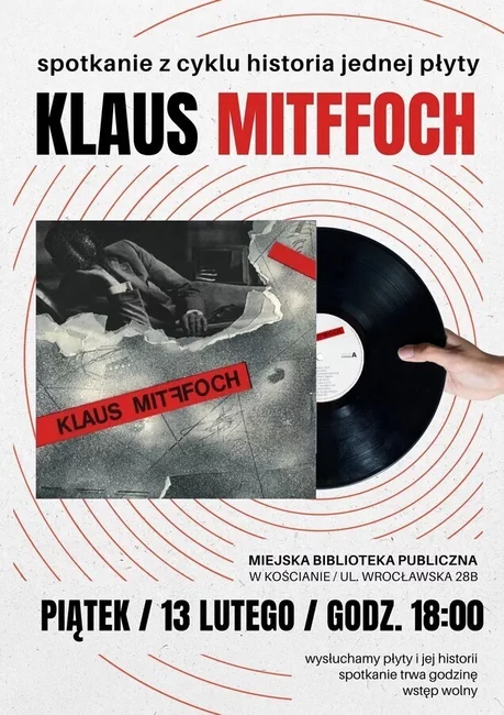 Kościańska biblioteka zaprasza na kolejną opowieść o ważnej płycie. Tym razem będzie to debiutancki album grupy Klaus Mitffoch z 1984 roku. To jedna z najważniejszych płyt w historii polskiej muzyki rockowej. Repertuar zawarty na tym krążku stylistycznie plasuje się pomiędzy post punkową agresją, a nowo falowymi brzmieniami. Całość dopełniają rewelacyjne teksty Lecha i Bożeny Janerków, które – tak jak muzyka - zachwycają do dziś.