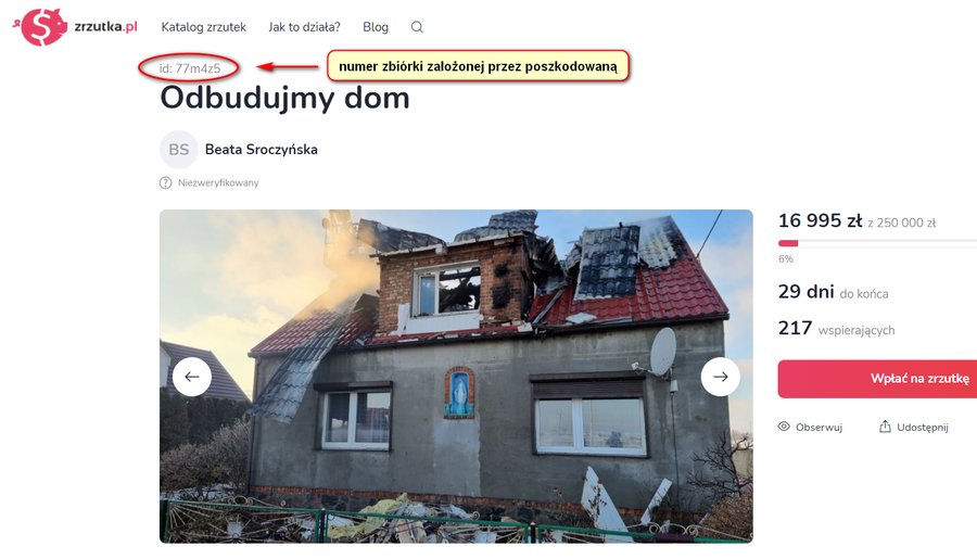 Zrzutka założona przez poszkodowaną jest pod adresem zrzutka.pl/77m4z5