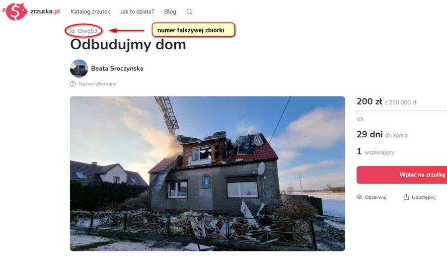 W serwisie zrzutka.pl pojawiła się fałszywa zrzutka na odbudowę domu pogorzelców ze Starej Przysieki Pierwszej.