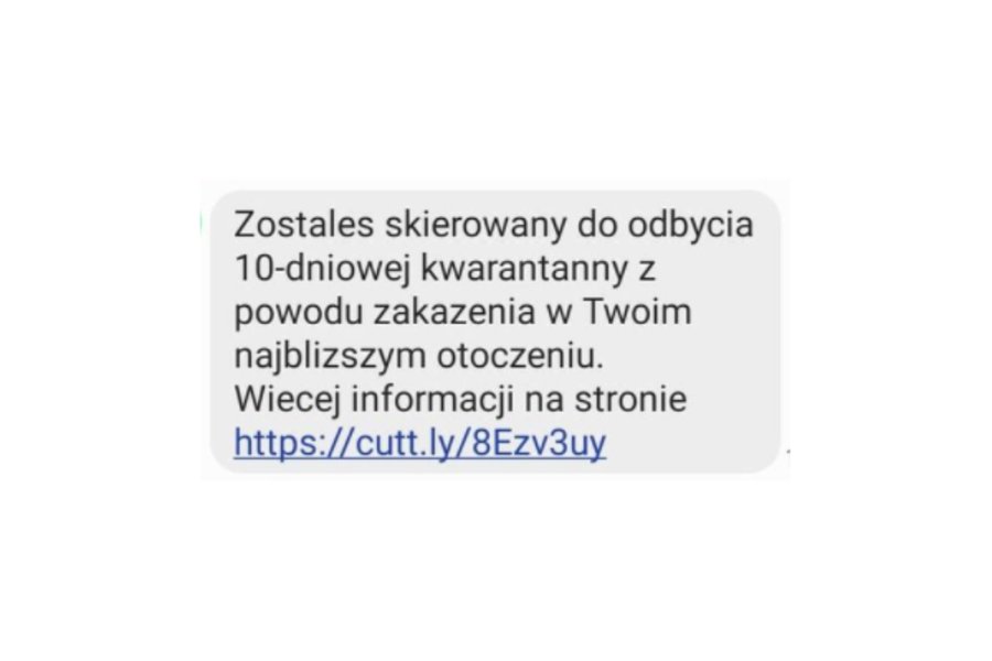SMS z informacją o nałożeniu kwarantanny z linkiem kierującym na stronę internetową jest próbą wyłudzenia danych osobowych.