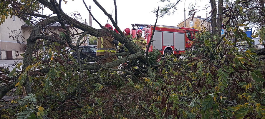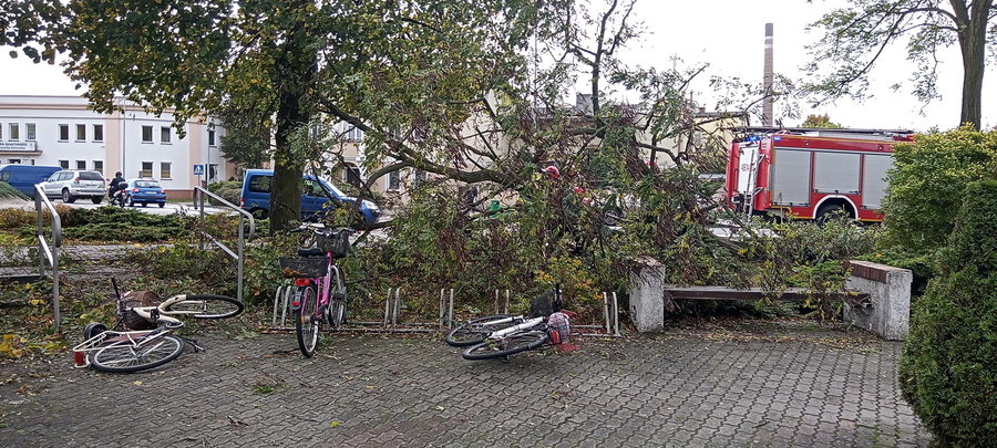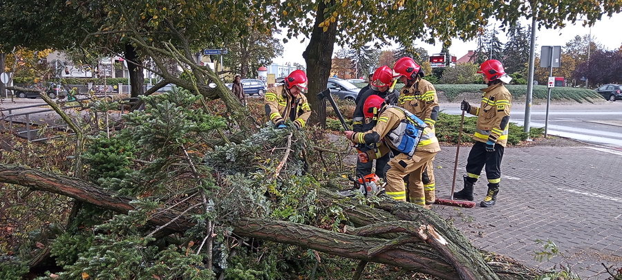 Około godziny 13. wiatr powalił drzewo przed bankiem przy Rondzie Solidarności w Kościanie (na zdjęciach). Z kolei na Placu Paderewskiego wyrwane z korzeniami drzewo zablokowało wyjazd z ulicy Bernardyńskiej. Drzewo upadło na jezdnię i chodnik tuż przy przejściu dla pieszych prowadzącym do bramy szpitala neuropsychiatrycznego. Na ulicy Kruszewskiego drzewo przewróciło się na zaparkowany samochód. Strażacy bylli wzywani do usuwania skutków wichury kilkadziesiąt razy.