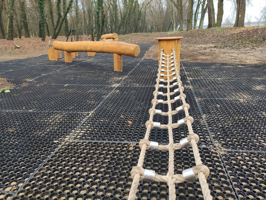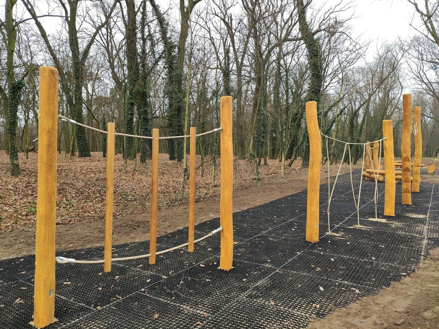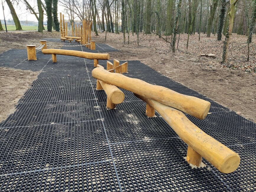 Do dyspozycji mieszkańców są następujące urządzenia: belka do balansowania w formie fali, pieńki skośne, belka do balansowania, lina artystyczna kombinacja, lina, pieńki do balansowania z płytą, pieńki zaokrąglone, labirynt do wspinania, girlanda, trawers linowy, wiszące pachołki, pieńki do balansowania.